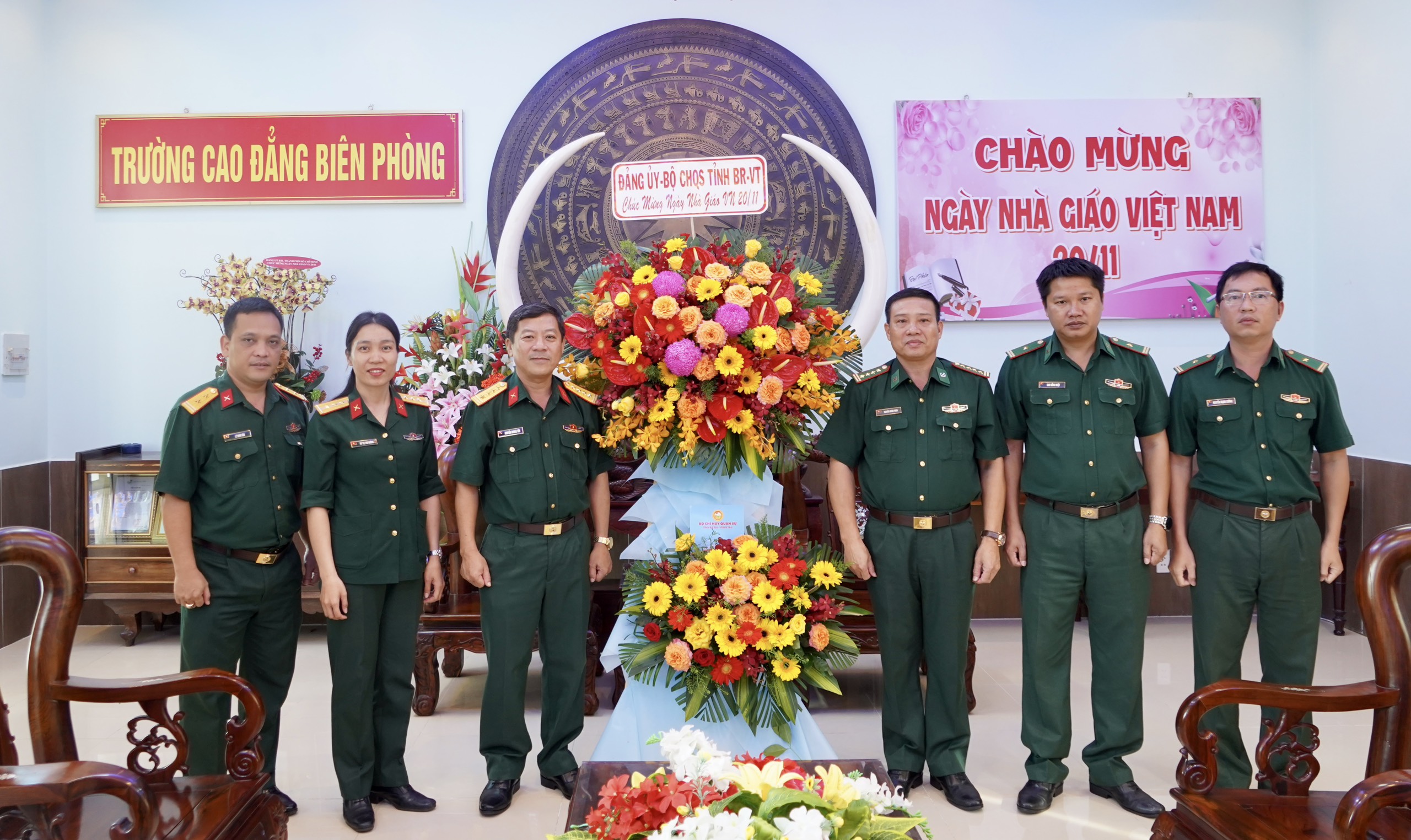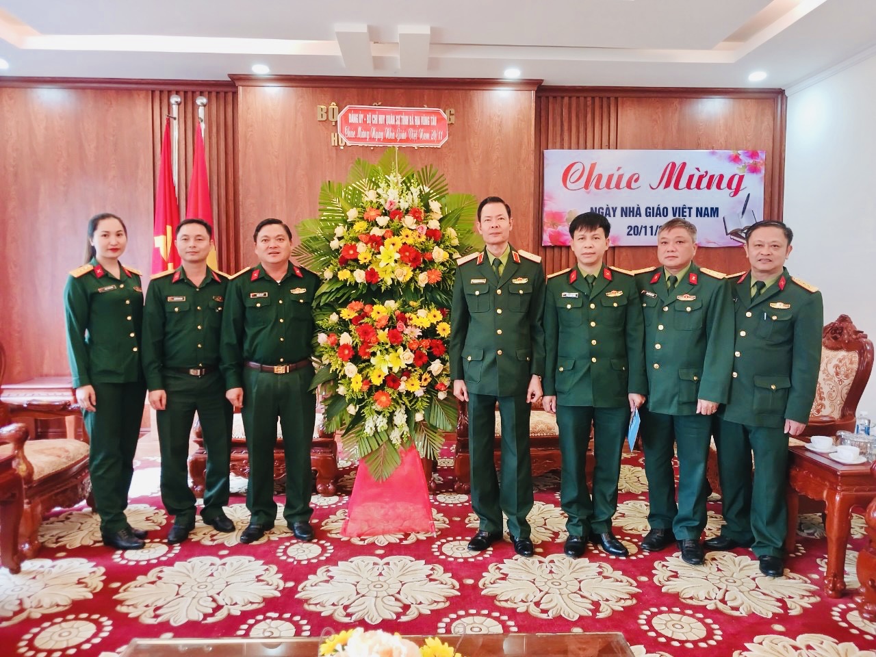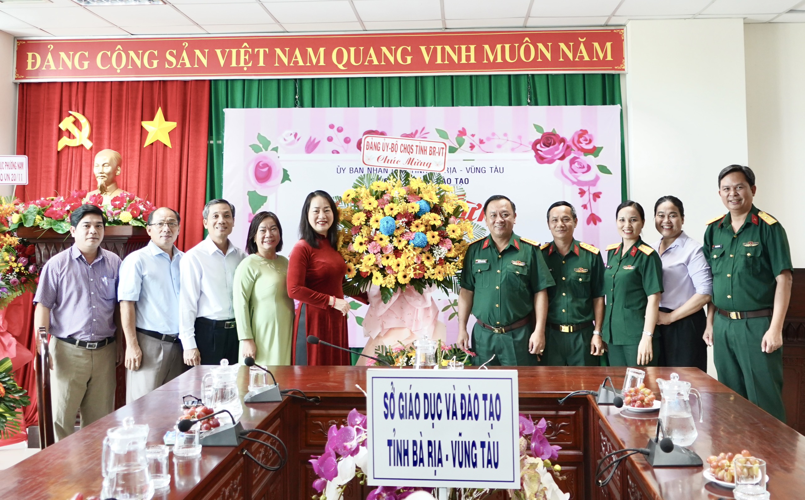Đại tá Nguyễn Thành Trung, Chính ủy Bộ CHQS tỉnh tặng hoa chúc mừng Sở Giáo dục và Đào tạo.