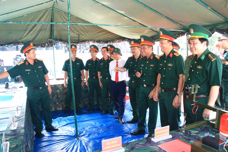 Các đại biểu tham quan trưng bày mô hình sáng kiến kỹ thuật của cơ quan, đơn vị tại lễ ra quân huấn luyện Bộ CHQS tỉnh Đồng Nai năm 2026.
