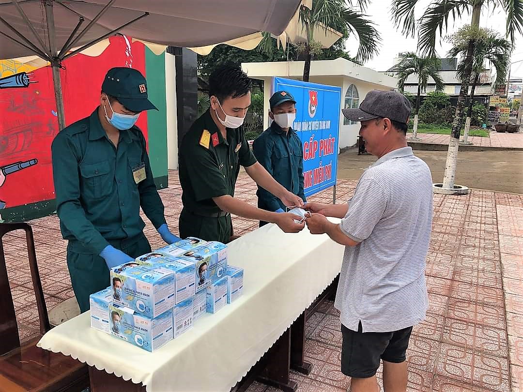 Cán bộ, chiến sĩ LLVT tỉnh cấp phát khẩu trang cho Nhân dân.