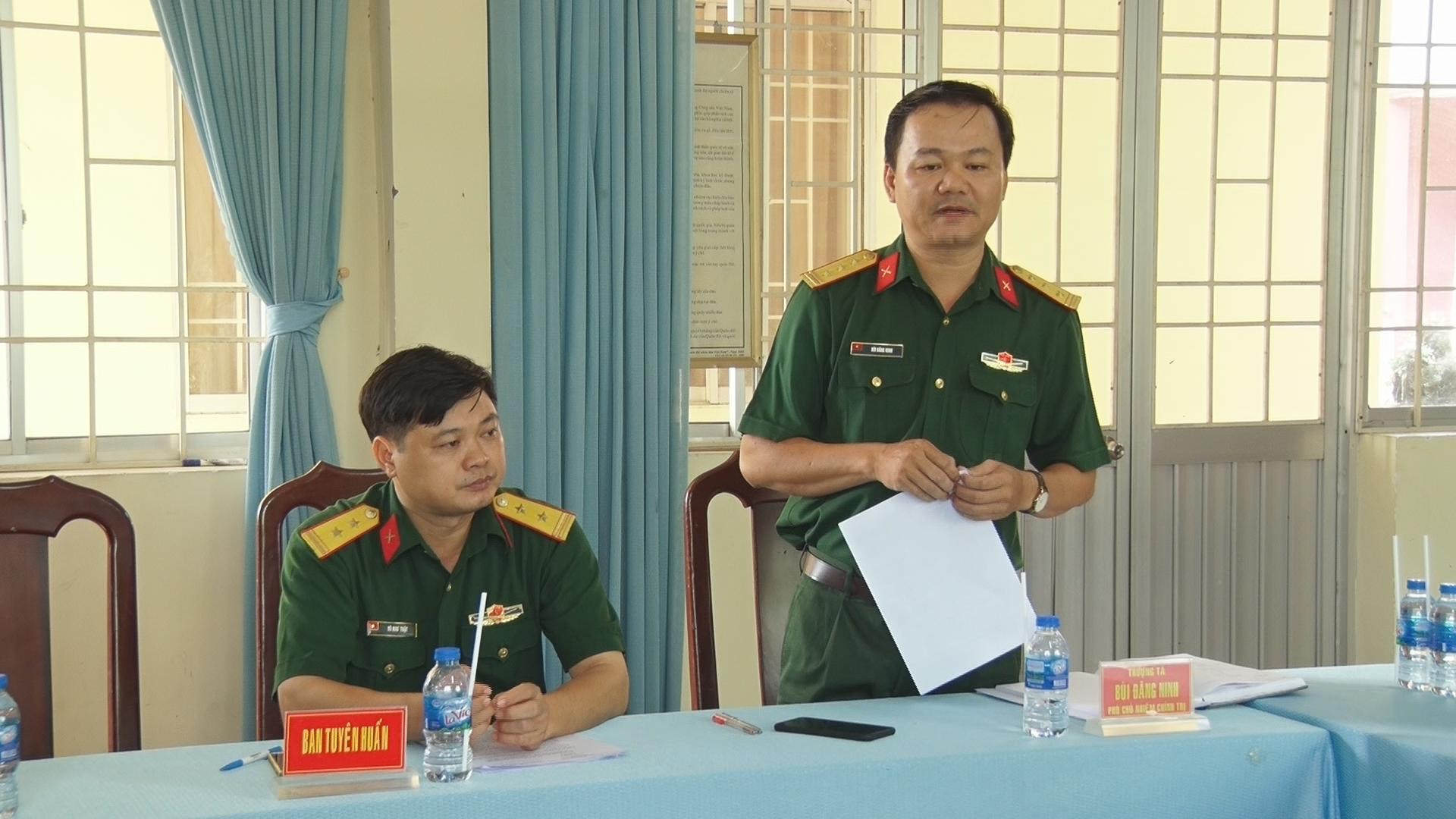 Thượng tá Bùi Đăng Ninh, Phó Chủ nhiệm chính trị Bộ CHQS tỉnh phát biểu tại buổi làm việc