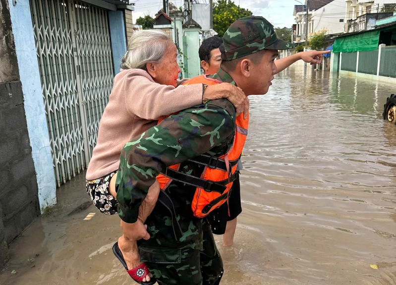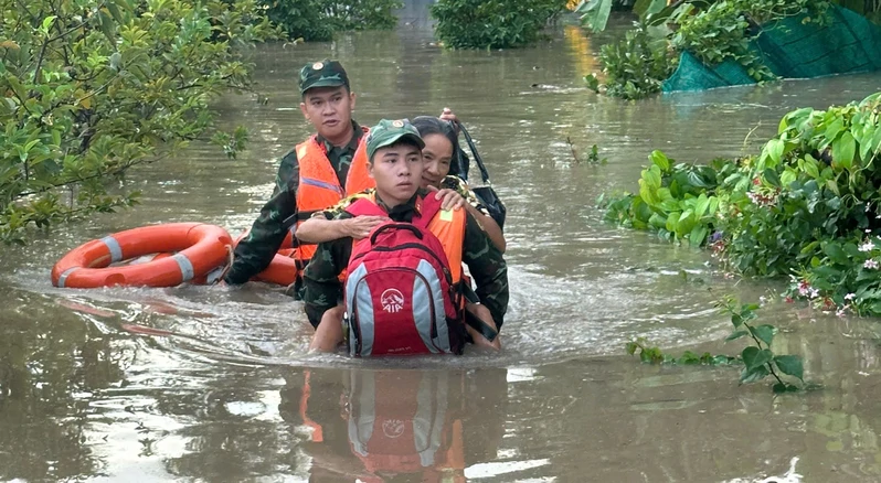 Cán bộ, chiến sĩ có mặt kịp thời tại các khu vực ngập lụt nặng để hỗ trợ sơ tán người dân.