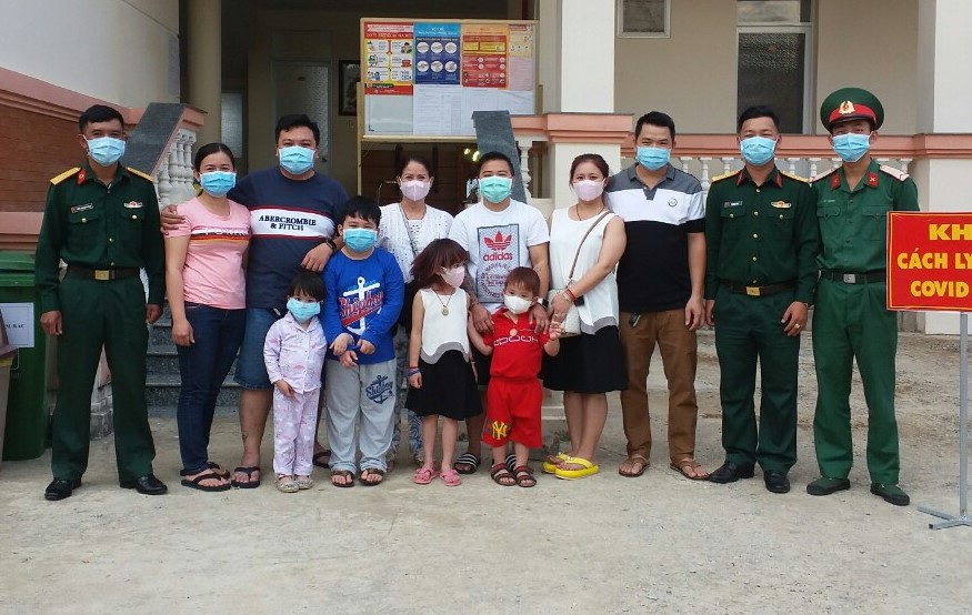 Một gia đình Việt kiều Mỹ 10 người chụp ảnh lưu niệm cùng chiến sĩ Quân y sau khi hoàn thành cách ly 14 ngày tại Bệnh xá H32, Bộ CHQS tỉnh Lâm Đồng.