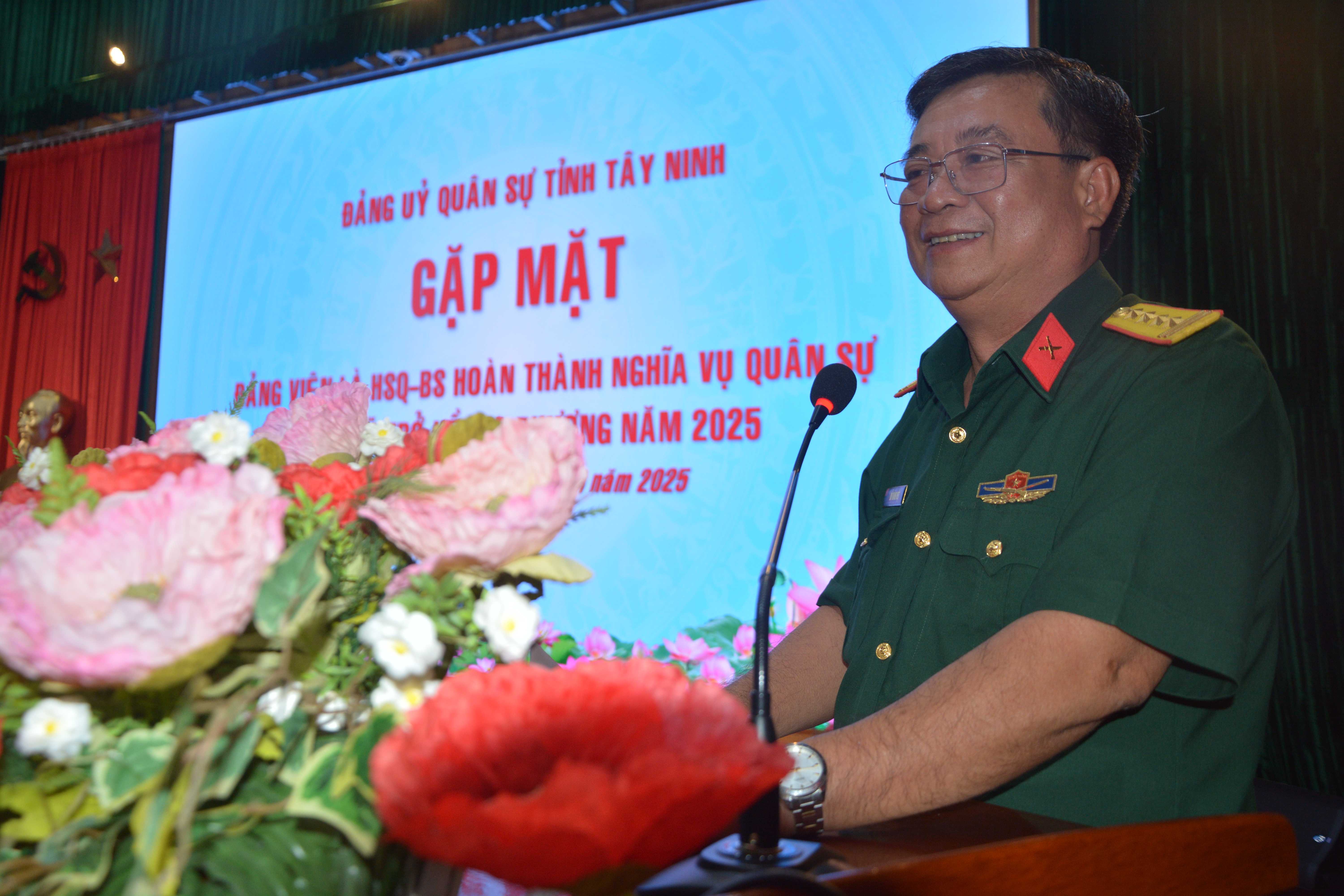 Đại tá Đỗ Thành Việt, Phó Chính ủy Bộ CHQS tỉnh phát biểu tại buổi gặp mặt.