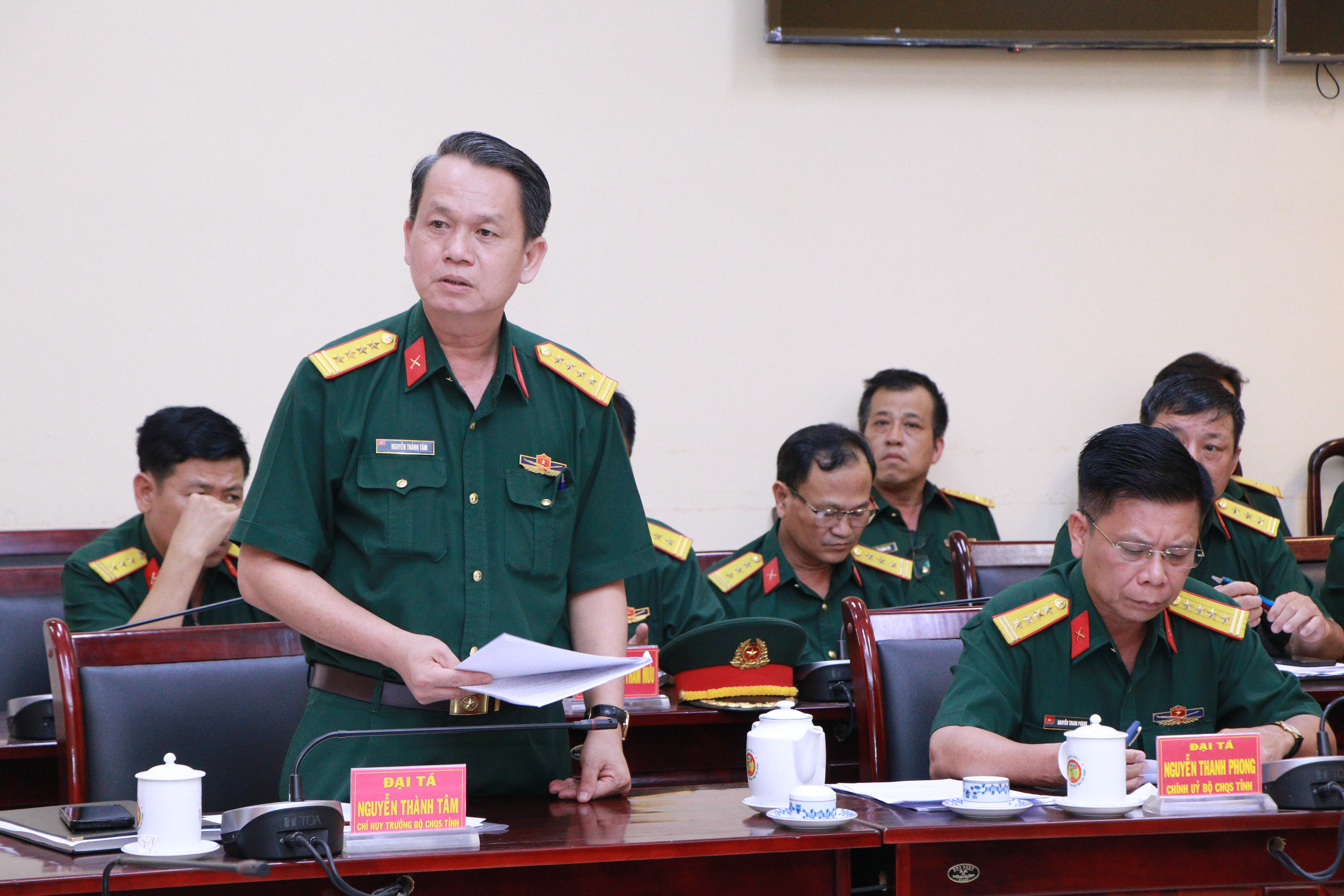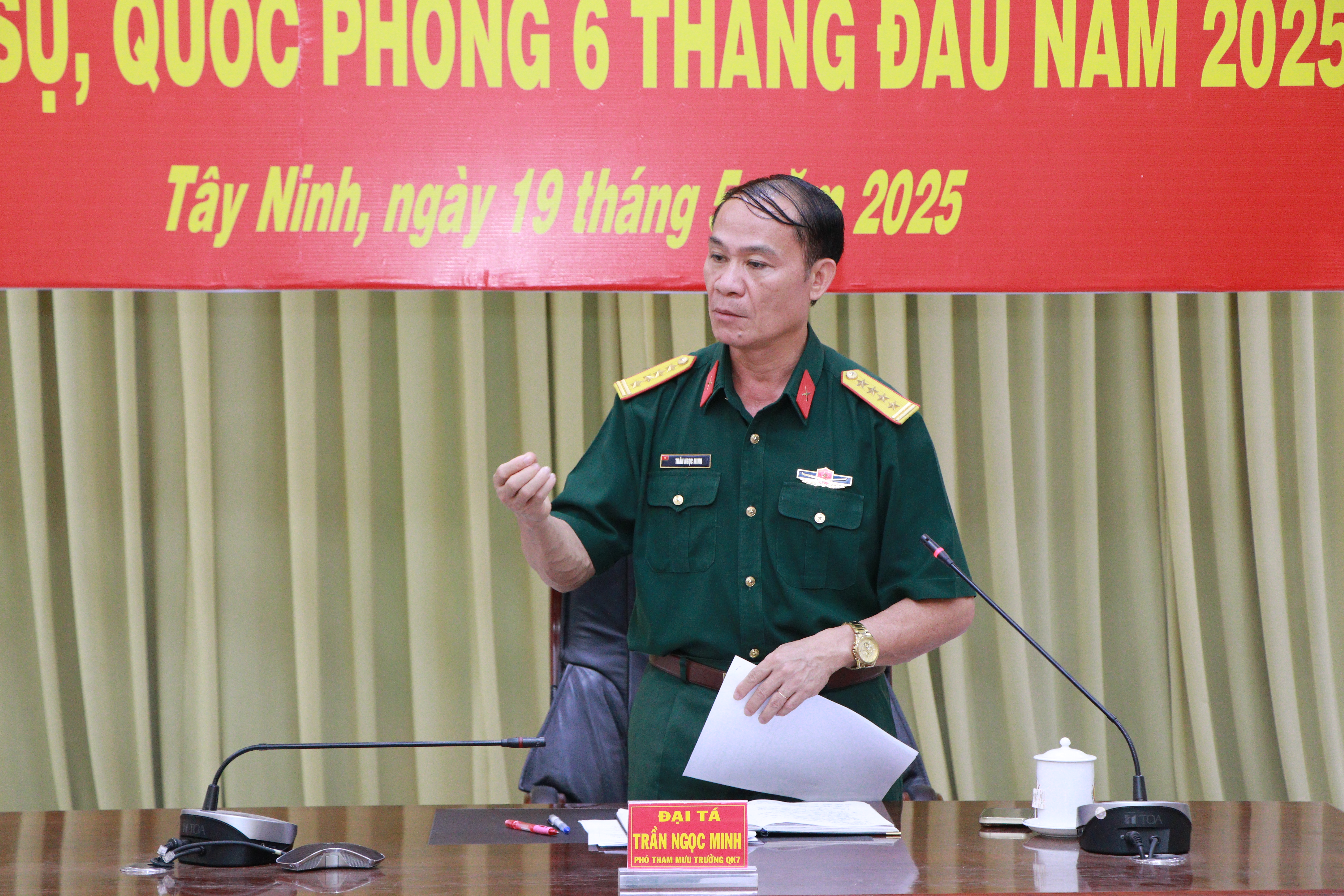 Đại tá Nguyễn Thành Tâm, Chỉ huy trưởng Bộ CHQS tỉnh Tây Ninh báo cáo kết quả thực hiện nhiệm vụ quân sự, quốc phòng 6 tháng đầu năm 2025.