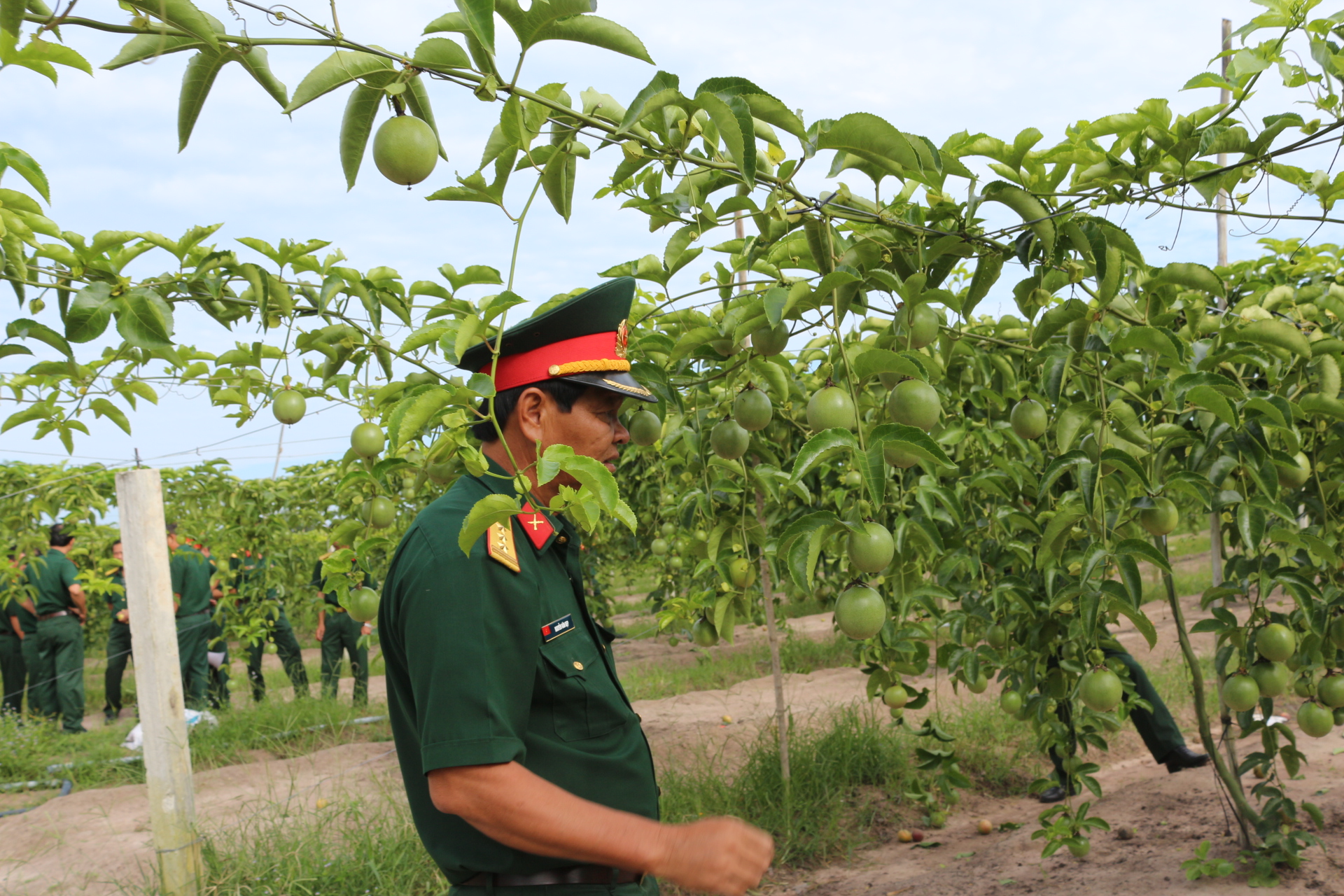Đoàn tham quan thăm vườn chanh dây và khu tăng gia sản xuất của Đại đội BB1 Tân Châu. Ảnh: Hồng Vũ