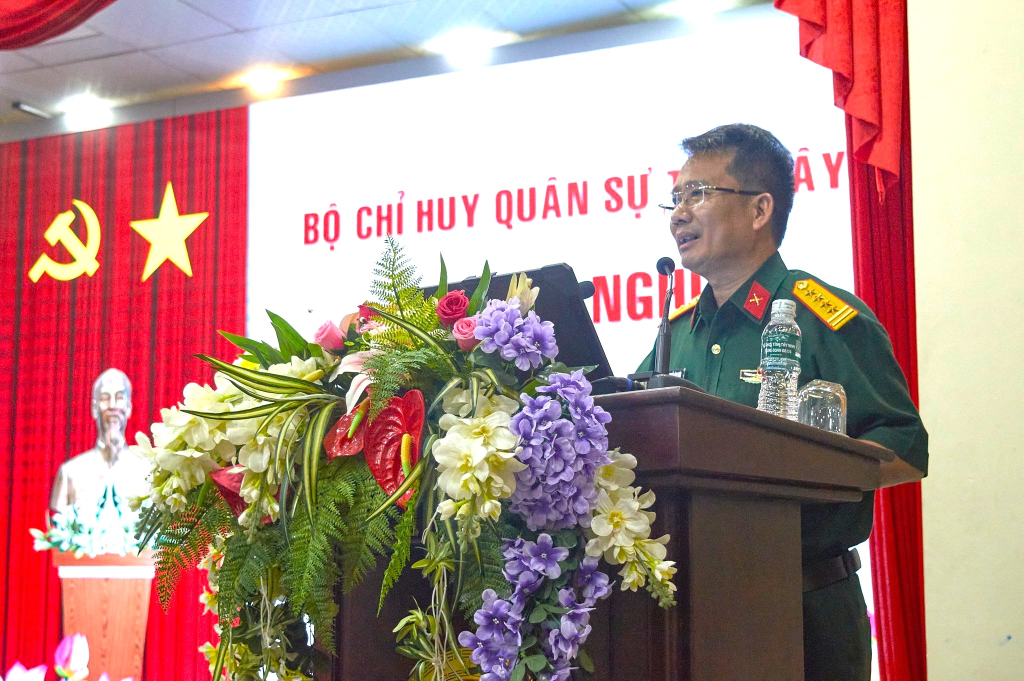 Đại tá Nguyễn Đình Huân, Phó Chỉ huy trưởng Bộ CHQS tỉnh phát biểu tại hội nghị.