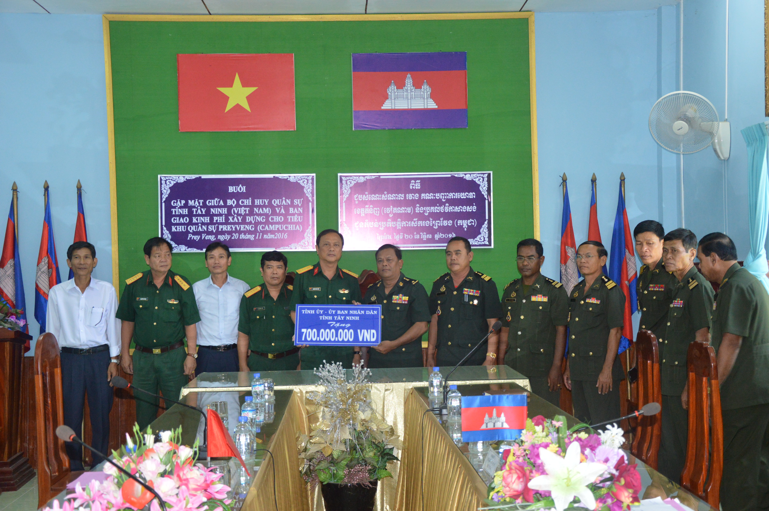 Bộ CHQS Tây Ninh trao hỗ trợ kinh phí của Tỉnh ủy-UBND tỉnh Tây Ninh cho Tiểu khu quân sự Pray Veng/Campuchia