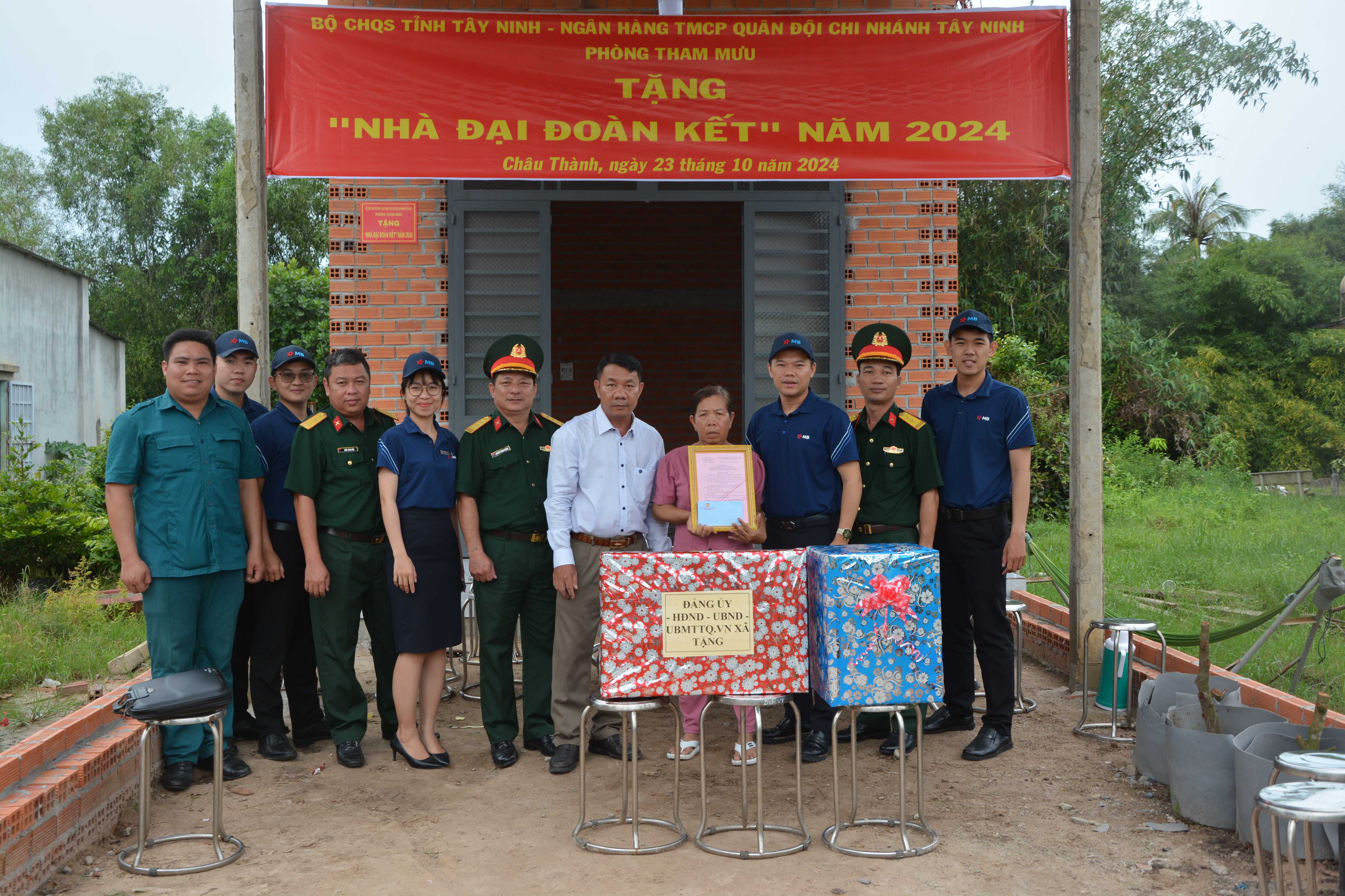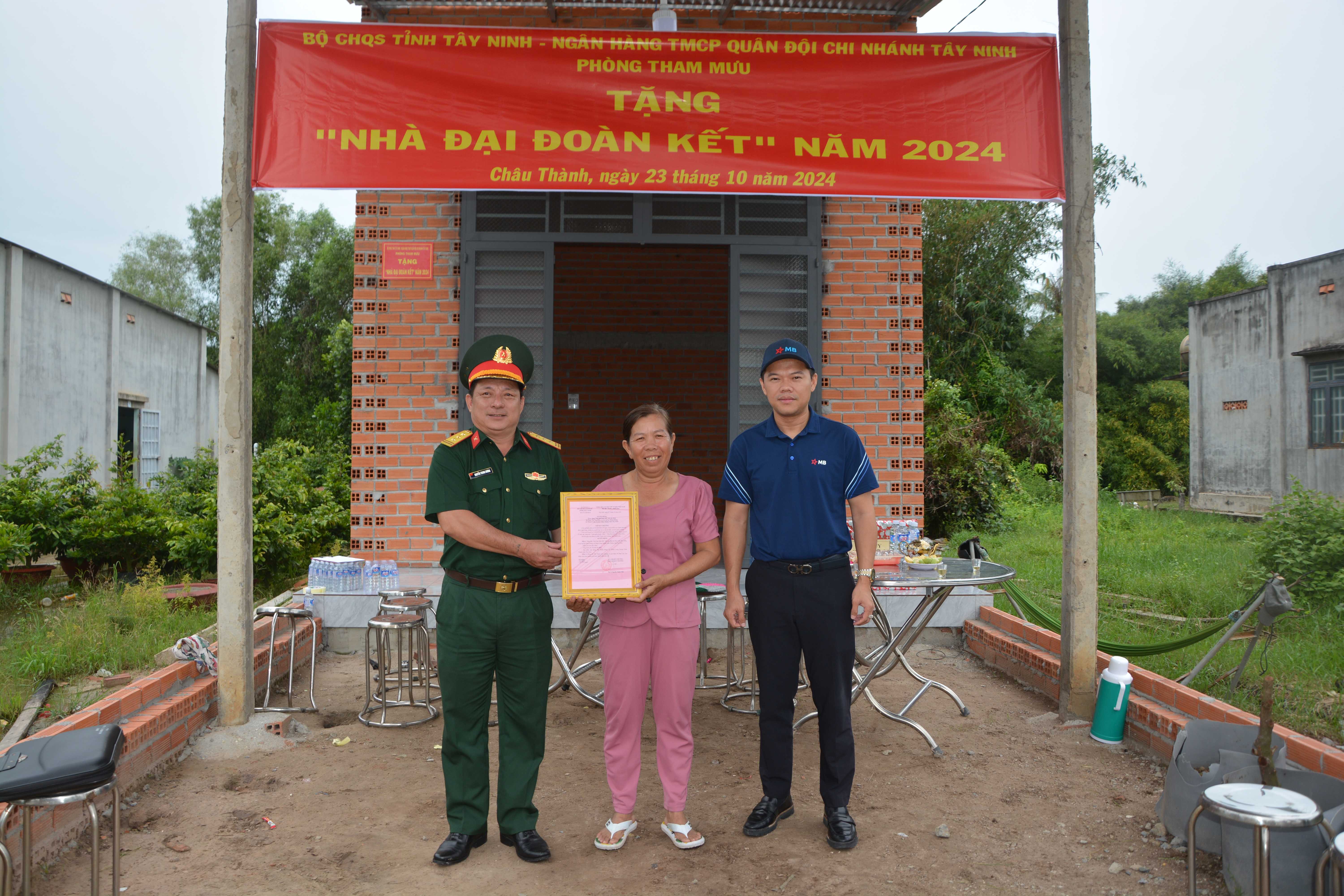 (QK7 Online) - Sáng 23/10, Bộ CHQS tỉnh Tây Ninh phối hợp với Ngân hàng thương mại cổ phần Quân đội chi nhánh Tây Ninh tổ chức bàn giao “Nhà đại đoàn kết” cho gia đình bà Phan Thị Thu Hiền, tổ 6, ấp Thành Đông, xã Thành Long, huyện Châu Thành.