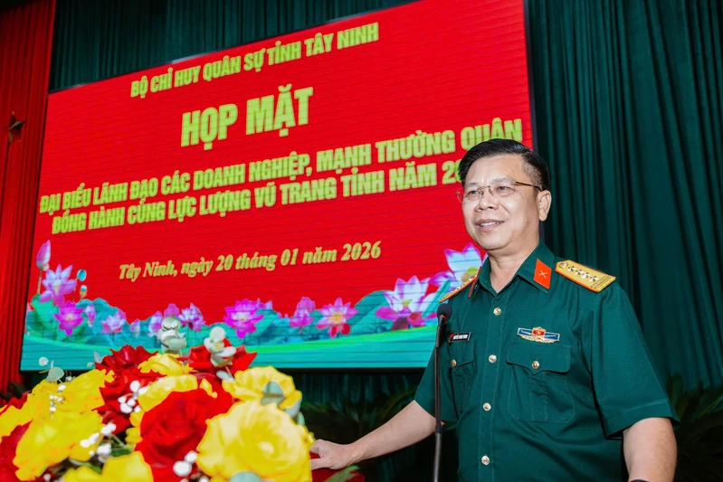 (QK7 Online) - Chiều 20/1, Bộ Chỉ huy Quân sự (CHQS) tỉnh Tây Ninh tổ chức họp mặt các doanh nghiệp, doanh nhân, mạnh thường quân tiêu biểu đã đồng hành, hỗ trợ lực lượng vũ trang (LLVT) tỉnh trong thực hiện công tác an sinh xã hội năm 2025. Đại tá Nguyễn Thanh Phong, Chính ủy Bộ Chỉ huy Quân sự tỉnh chủ trì buổi họp mặt.
