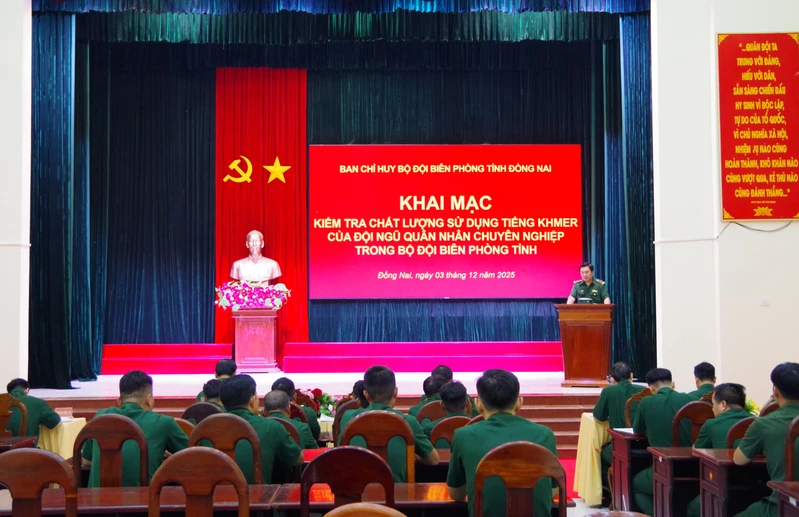 (QK7 Online) - Trong hai ngày 3 và 4/12, Ban Chỉ huy Bộ đội Biên phòng (BĐBP) tỉnh Đồng Nai tổ chức kiểm tra chất lượng sử dụng tiếng Khmer của đội ngũ quân nhân chuyên nghiệp (QNCN) đang công tác trong BĐBP tỉnh. Đại tá Nguyễn Anh Đức, Phó Chỉ huy trưởng Bộ CHQS tỉnh, Chỉ huy trưởng BĐBP tỉnh dự và phát biểu khai mạc.