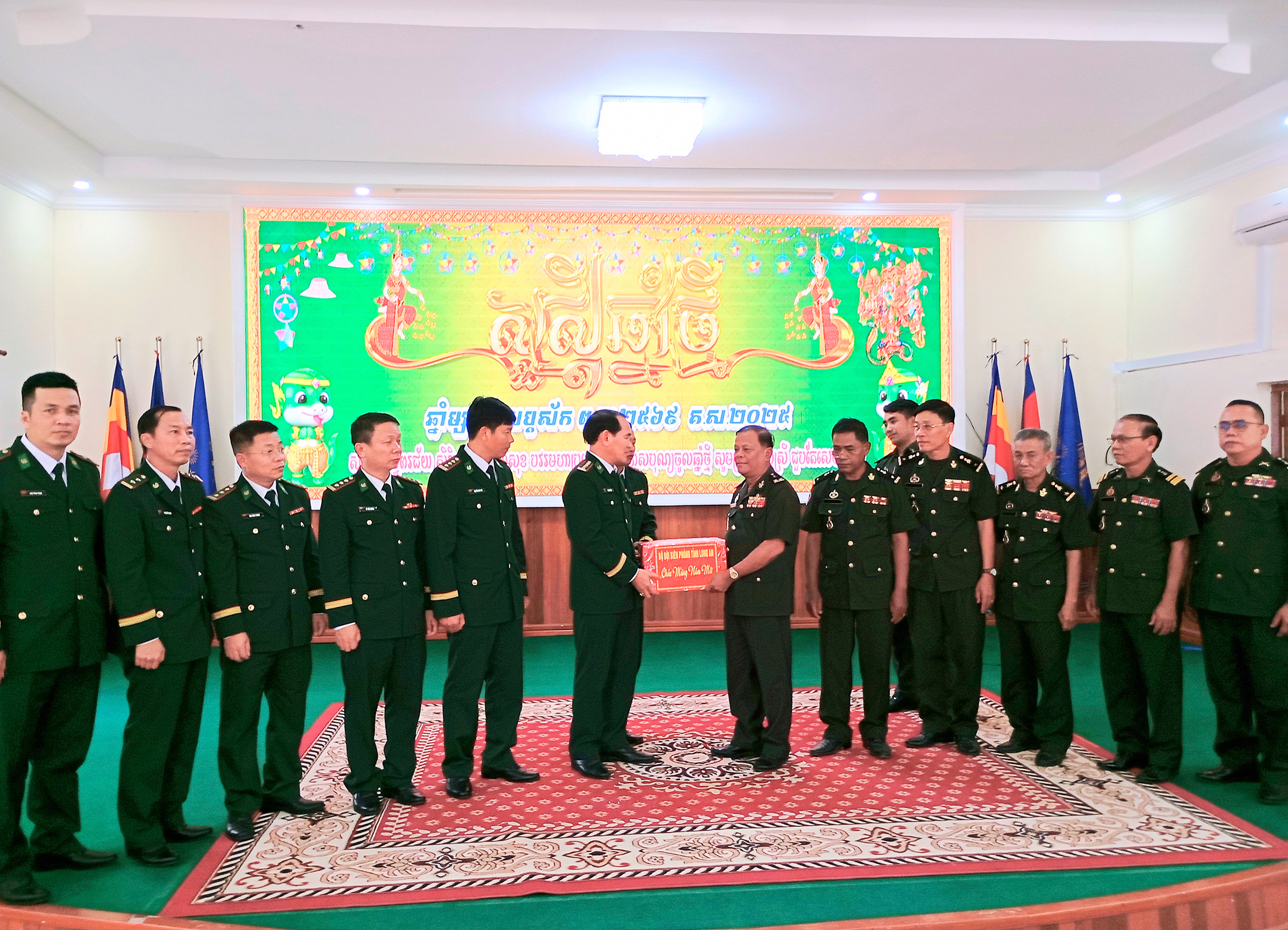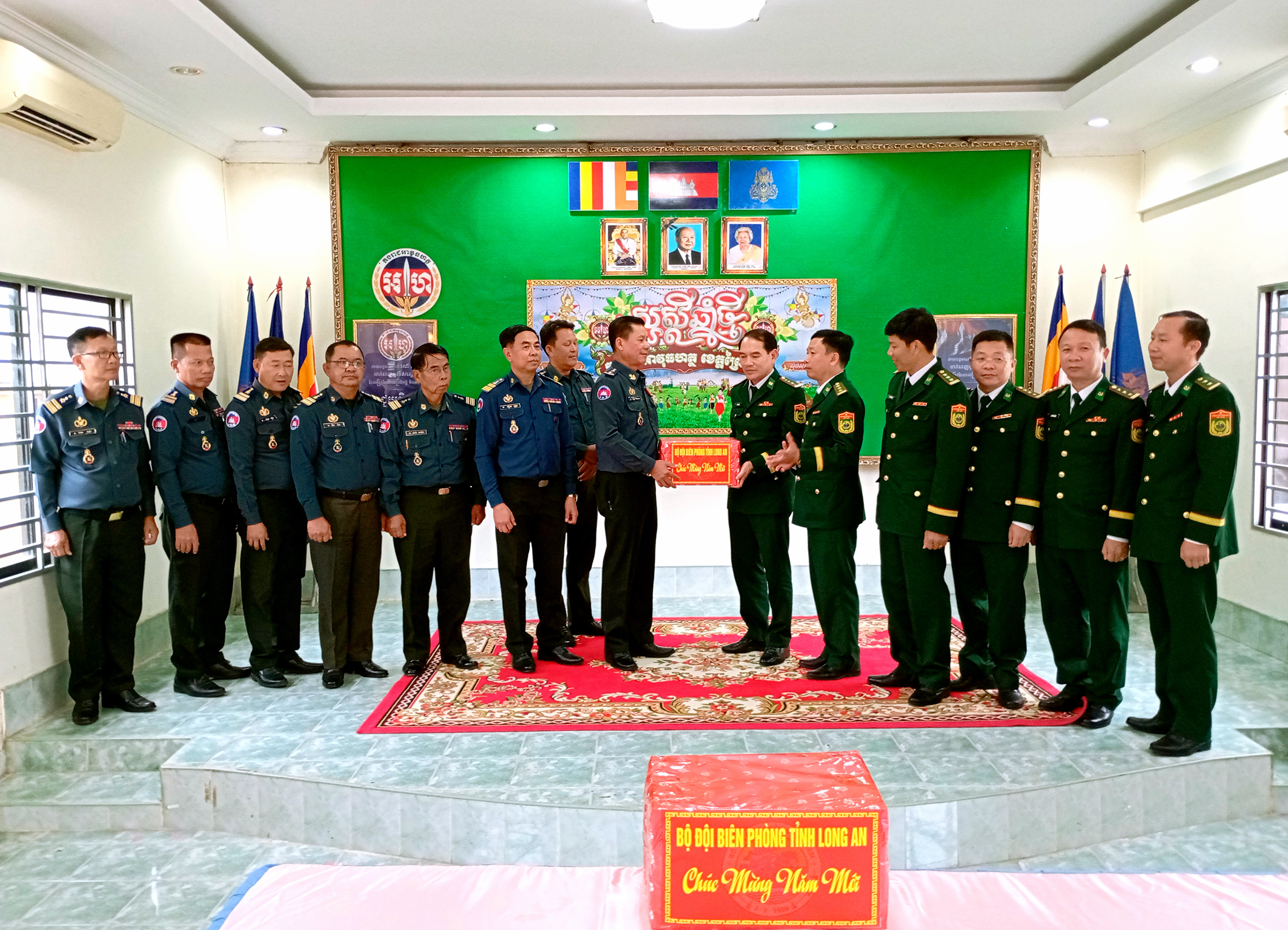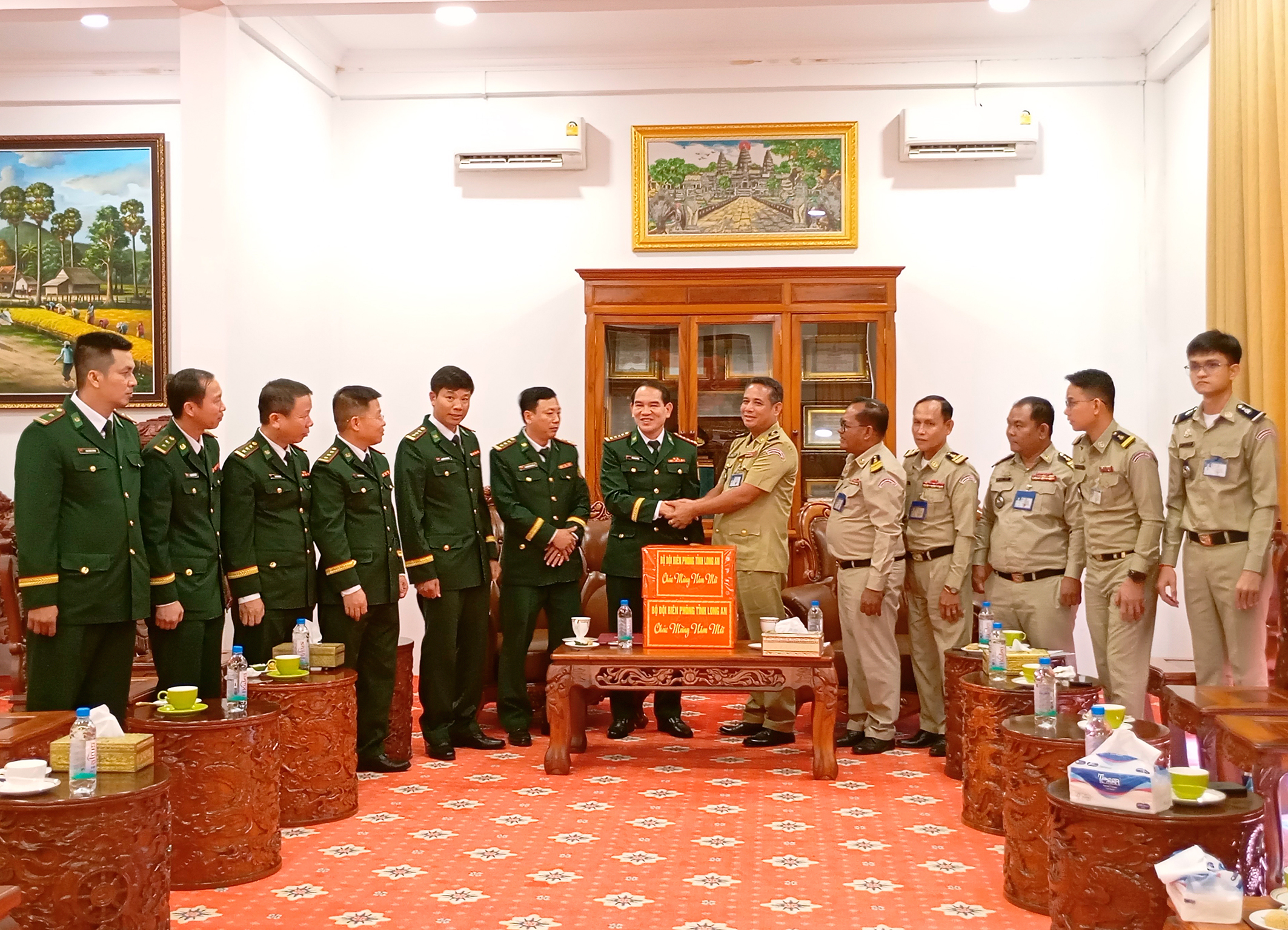 Đại tá Vũ Minh Tùng, Phó Chính ủy BĐBP tỉnh Long An tặng quà, chúc tết lực lượng Tiểu khu Quân sự tỉnh Pray Veng.