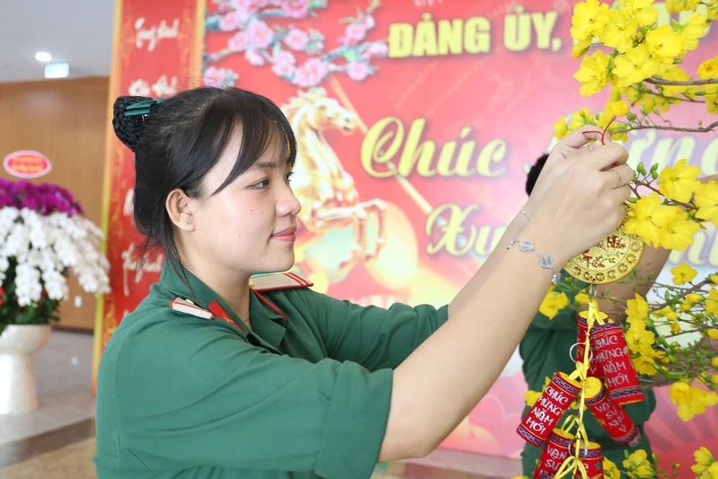 Cán bộ, chiến sĩ Tiểu đoàn 180, Bộ Tham mưu Quân khu cùng chiến sĩ trang trí rực rỡ doanh trại.