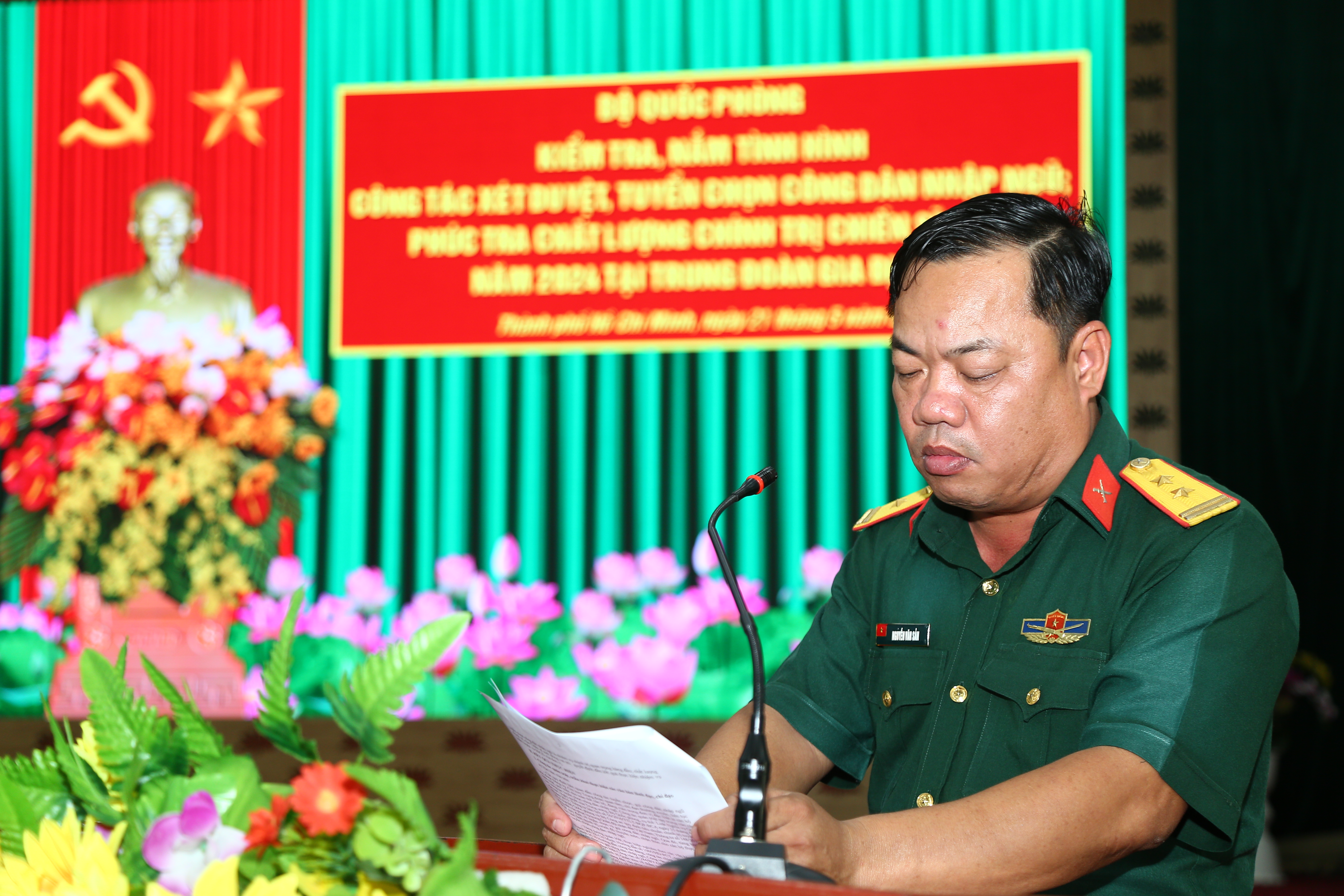 Chỉ huy Trung đoàn Gia Định báo cáo kết quả đạt được trong công tác huấn luyện, nắm bắt tình hình tư tưởng của CSM.
