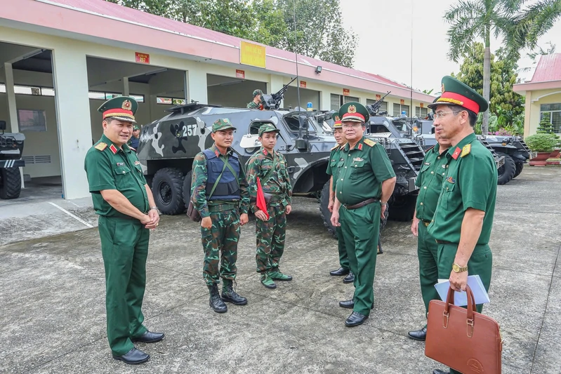 Thiếu tướng Phạm Anh Tuấn, Chủ nhiệm Chính trị Quân khu (bìa trái) cùng Thiếu tướng Phạm Văn Hoạt, Phó Cục trưởng Cục Tác chiến kiểm tra công tác sẵn sàng chiến đấu tại Đại đội Trinh sát cơ giới.