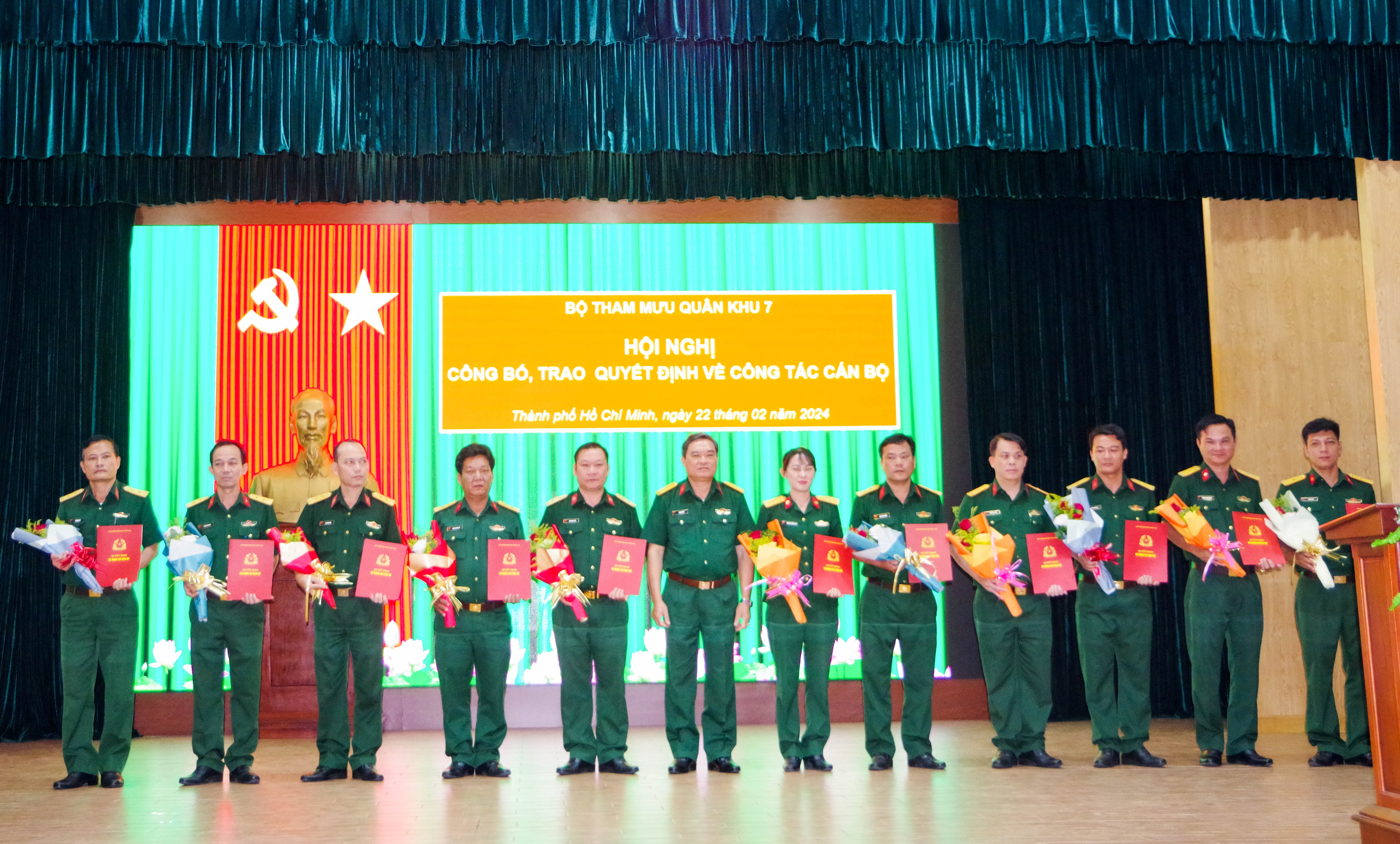 (QK7 Online) - Sáng 22/2, Bộ Tham mưu Quân khu 7 tổ chức Hội nghị công bố, trao quyết định nghỉ hưu, điều động, bổ nhiệm, bổ nhiệm lại cán bộ. Dự, chủ trì có Đại tá Phạm Phú Ý – Bí thư Đảng ủy Bộ Tham mưu, Phó Tham mưu trưởng Quân khu; Thiếu tướng Nguyễn Văn Hoàng – Phó Tham mưu trưởng Quân khu.