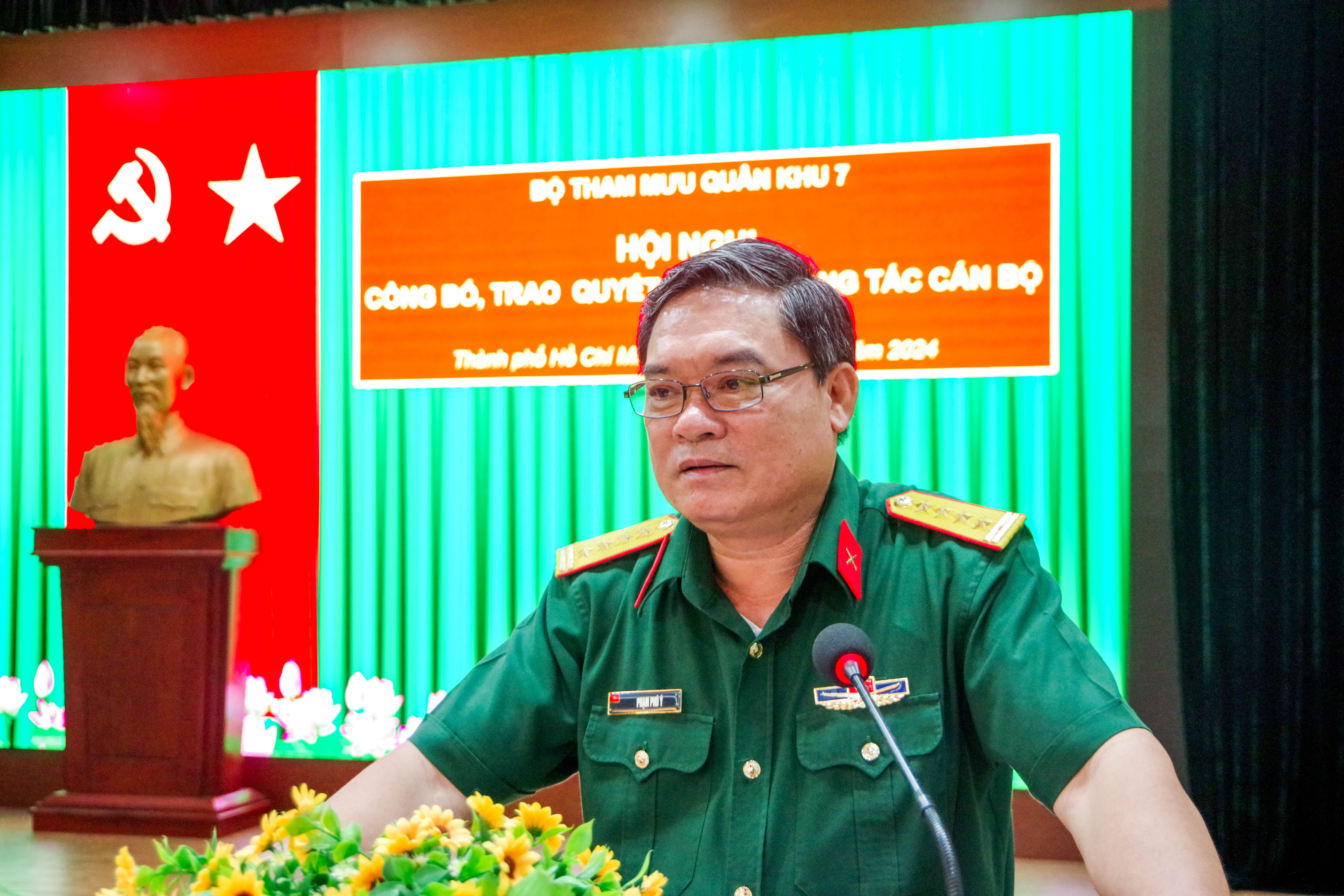 Thay mặt Ban Thường vụ Đảng ủy Bộ Tham mưu Quân khu, Đại tá Phạm Phú Ý chúc mừng các đồng chí nhận quyết định lần này và ghi nhận, đánh giá cao sự nỗ lực, cố gắng với những kết quả thực hiện nhiệm vụ của các đồng chí; đồng thời đề nghị trong thời gian tới, trên từng cương vị công tác mới cần nhanh chóng nắm bắt chức năng nhiệm vụ, tình hình cơ quan, đơn vị; nỗ lực trong công tác, làm tốt chức trách, nhiệm vụ, kịp thời tham mưu, đề xuất cùng các đồng chí trong cơ quan, đơn vị hoàn thành tốt mọi nhiệm vụ được cấp trên giao. Mỗi đồng chí tiếp tục giữ vững, phát huy phẩm chất đạo đức cách mạng, không ngừng phấn đấu học tập, rèn luyện, nâng cao hơn nữa trình độ chuyên môn nghiệp vụ, chấp hành nghiêm pháp luật Nhà nước, kỷ luật Quân đội, quy định của cơ quan, đơn vị.