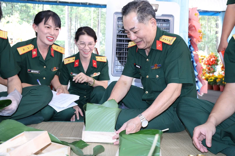 Đại tá Trần Hữu Nhân, Phó Tham mưu trưởng Quân khu gói bánh cùng cán bộ, chiến sĩ.