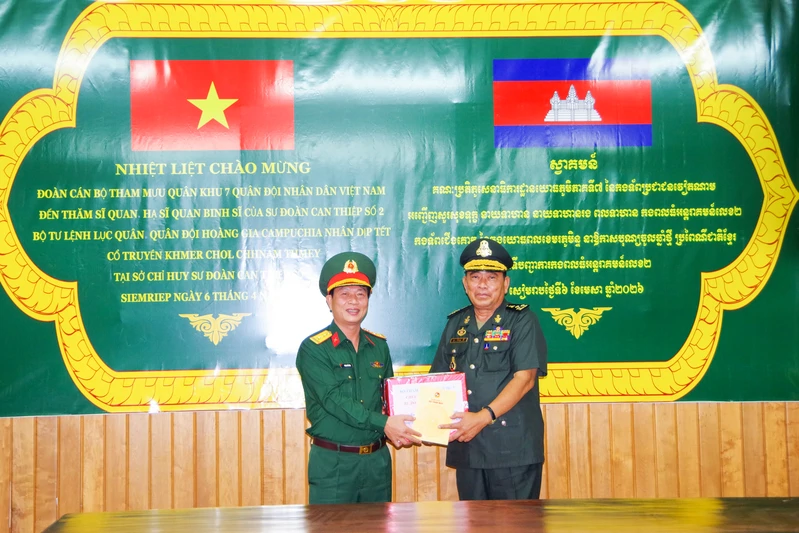 (QK7 Online) - Ngày 6/4, đoàn công tác Bộ Tham mưu Quân khu 7 do Đại tá Phùng Thế Hùng, Phó Tham mưu trưởng Quân khu làm Trưởng đoàn đến dâng hương, viếng Đài tưởng niệm Quân tình nguyện Việt Nam tại thành phố Seam Reap, tỉnh Seam Reap và chúc Tết Sư đoàn Can thiệp số 2, Bộ Tư lệnh Lục quân, Quân đội Hoàng gia Campuchia nhân dịp Tết cổ truyền Chol Chnam Thmay năm 2026.