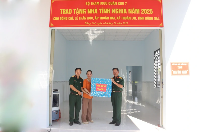 (QK7 Online) - Ngày 18/12, nhân dịp kỷ niệm 81 năm Ngày thành lập Quân đội nhân dân Việt Nam (22/12/1944 - 22/12/2025), 36 năm Ngày hội quốc phòng toàn dân (22/12/1989 - 22/12/2025) và hướng tới kỷ niệm 80 năm Ngày truyền thống Bộ Tham mưu Quân khu (20/02/1946 - 20/02/2026), Bộ Tham mưu Quân khu tổ chức lễ trao “Nhà tình nghĩa” cho gia đình Thiếu tá QNCN Lê Trần Đức và ông Bùi Đặng Tuấn Anh.