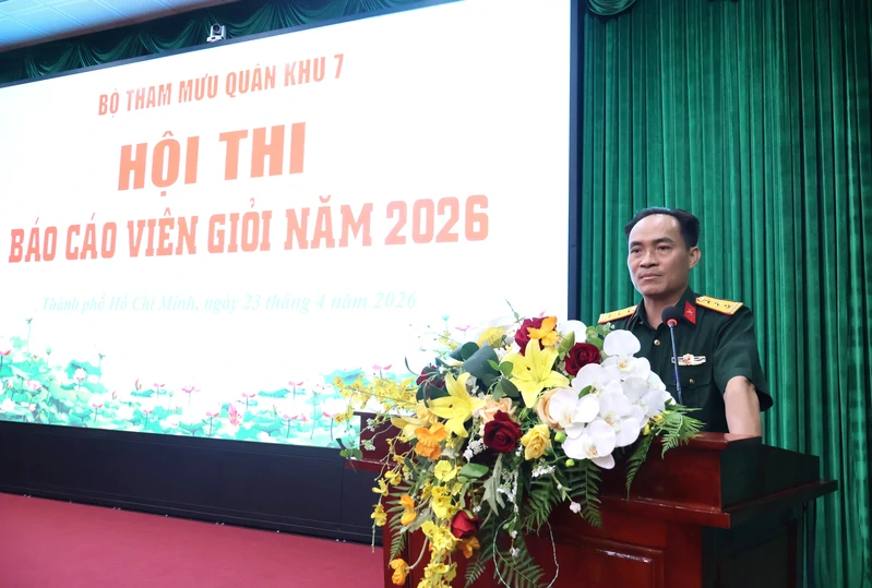(QK7 Online) – Chiều 23/4, Bộ Tham mưu Quân khu bế mạc Hội thi Báo cáo viên giỏi năm 2026. Thượng tá Trần Thái Khương, Chủ nhiệm Chính trị Bộ Tham mưu Quân khu dự, phát biểu bế mạc.