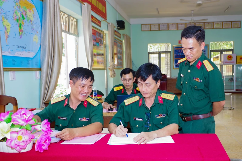 Thượng tá Nguyễn Văn Lộc, Phó trưởng Phòng Quân huấn - Nhà trường (bên trái) kiểm tra hệ thống sổ sách, giáo án huấn luyện tại Trung đoàn Gia Định.