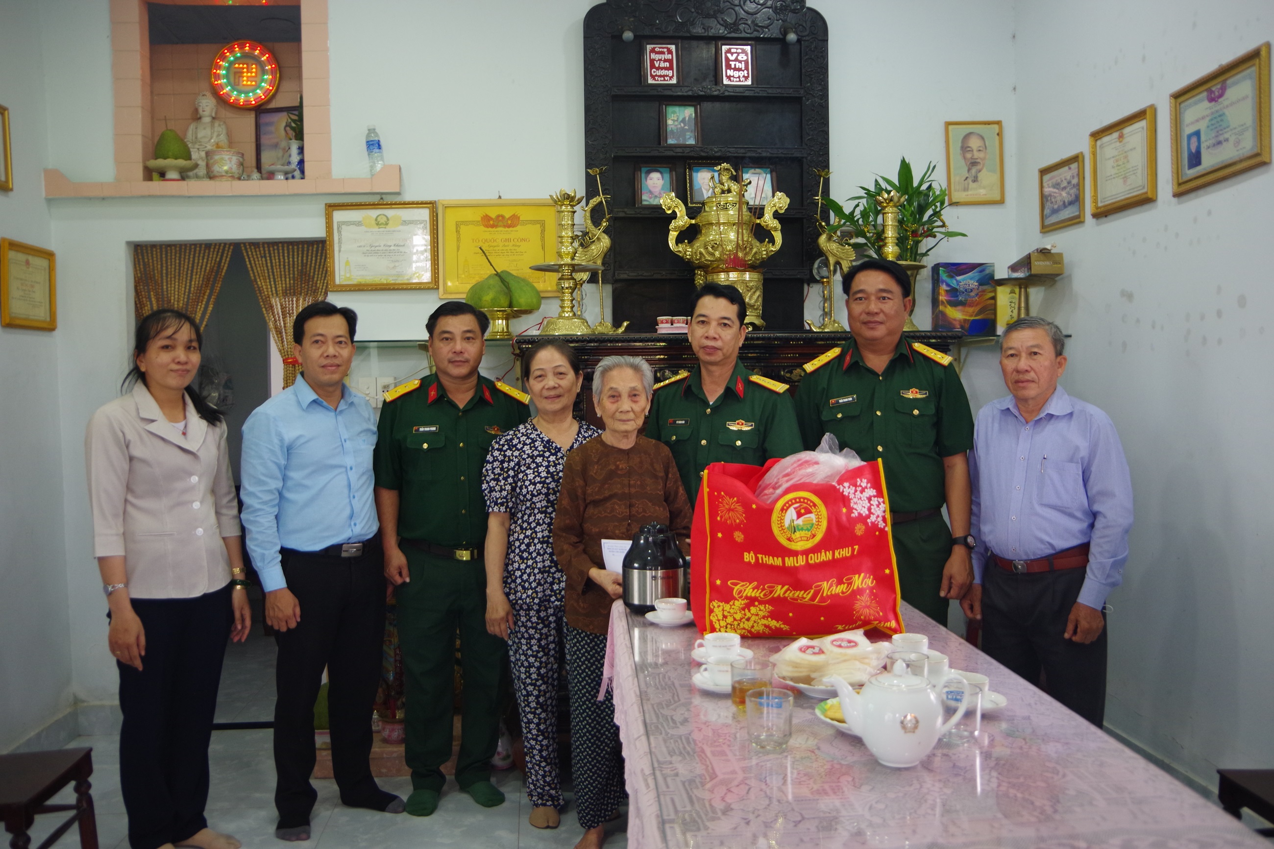 (QK7 Online) - Chào mừng kỷ niệm 95 năm Ngày thành lập Đảng Cộng sản Việt Nam (03/02/1930 - 03/02/2025) và mừng Xuân Ất Tỵ năm 2025, đoàn công tác Bộ Tham mưu Quân khu và Ban CHQS huyện Cần Giuộc, tỉnh Long An đến thăm, tặng quà gia đình chính sách, Mẹ Việt Nam Anh hùng Phan Thị Nhị, có 2 người con là liệt sĩ Nguyễn Quốc Hùng và Nguyễn Công Thành đã hy sinh vì sự nghiệp xây dựng và bảo vệ Tổ quốc tại xã Thuận Thành.
