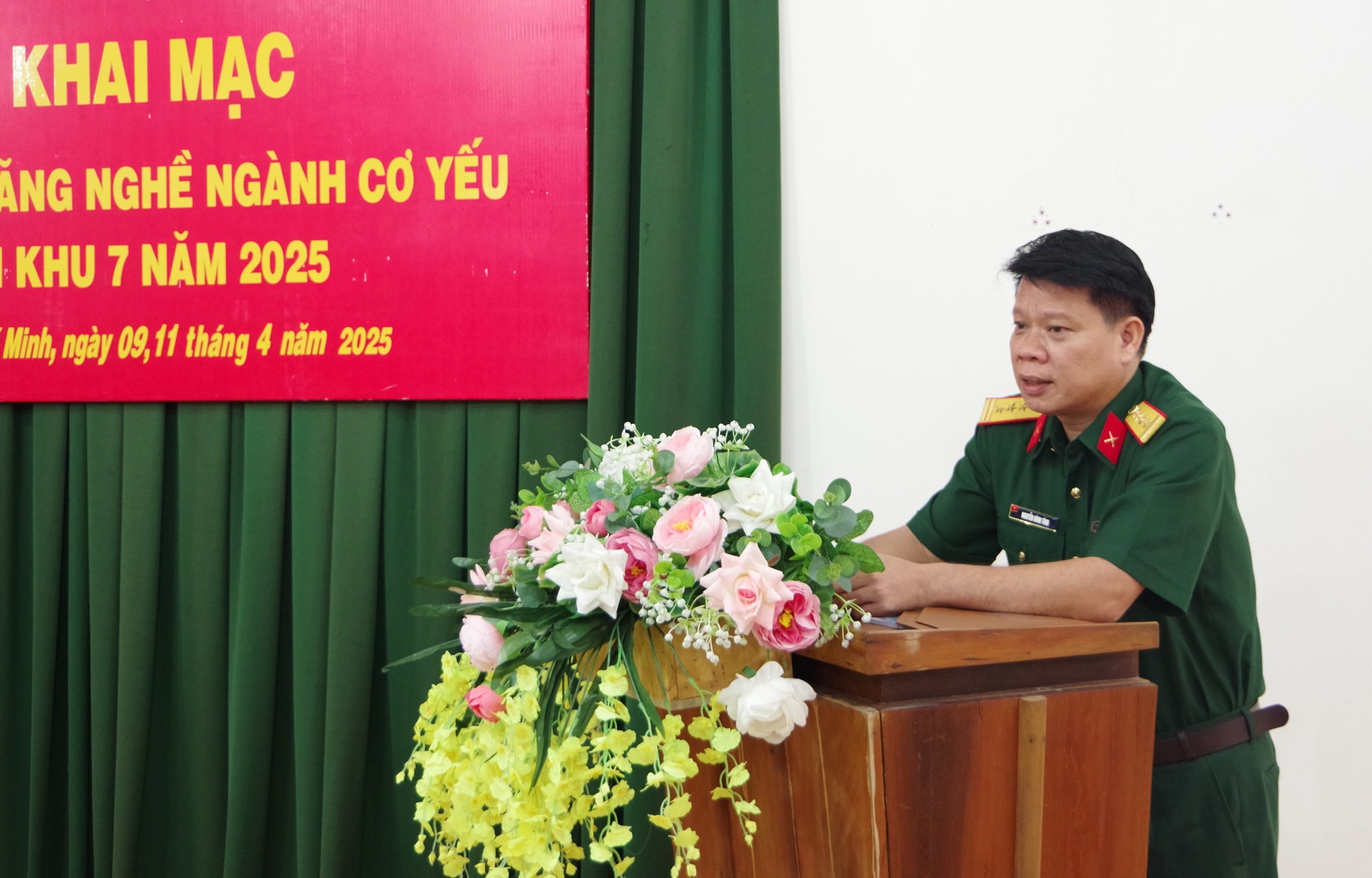 Đại tá Nguyễn Đình Tính, Trưởng phòng Cơ yếu Quân khu phát biểu khai mạc kiểm tra kỹ năng nghề ngành Cơ yếu Quân khu năm 2025.