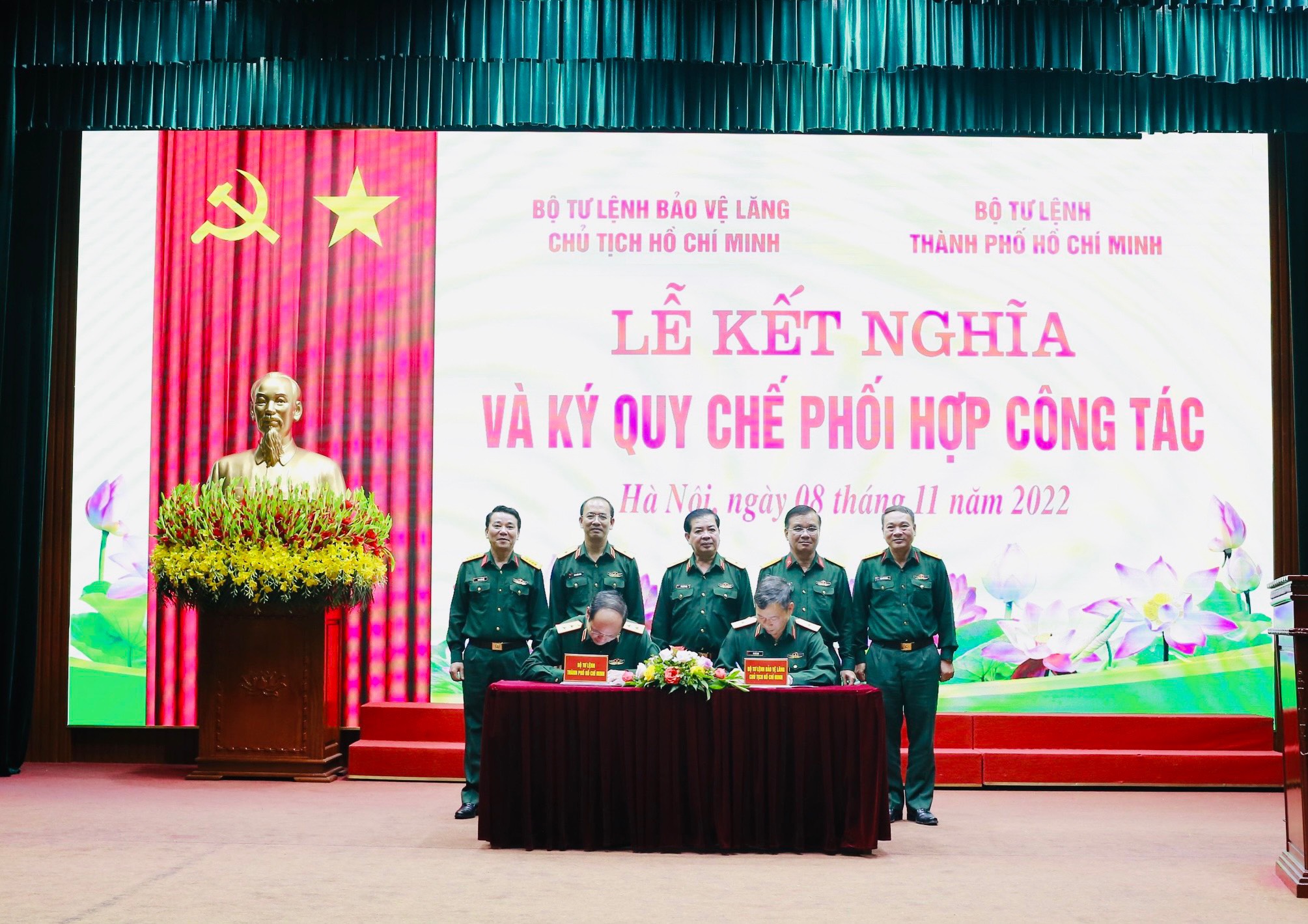 Các đồng chí: Trung tướng Nguyễn Văn Nam, Tư lệnh Bộ tư lệnh TP Hồ Chí Minh; Thiếu tướng Bùi Hải Sơn, Quyền Trưởng ban Ban Quản lý Lăng, Tư lệnh Bộ Tư lệnh Bảo vệ Lăng Chủ tịch Hồ Chí Minh đồng chủ trì buổi lễ.