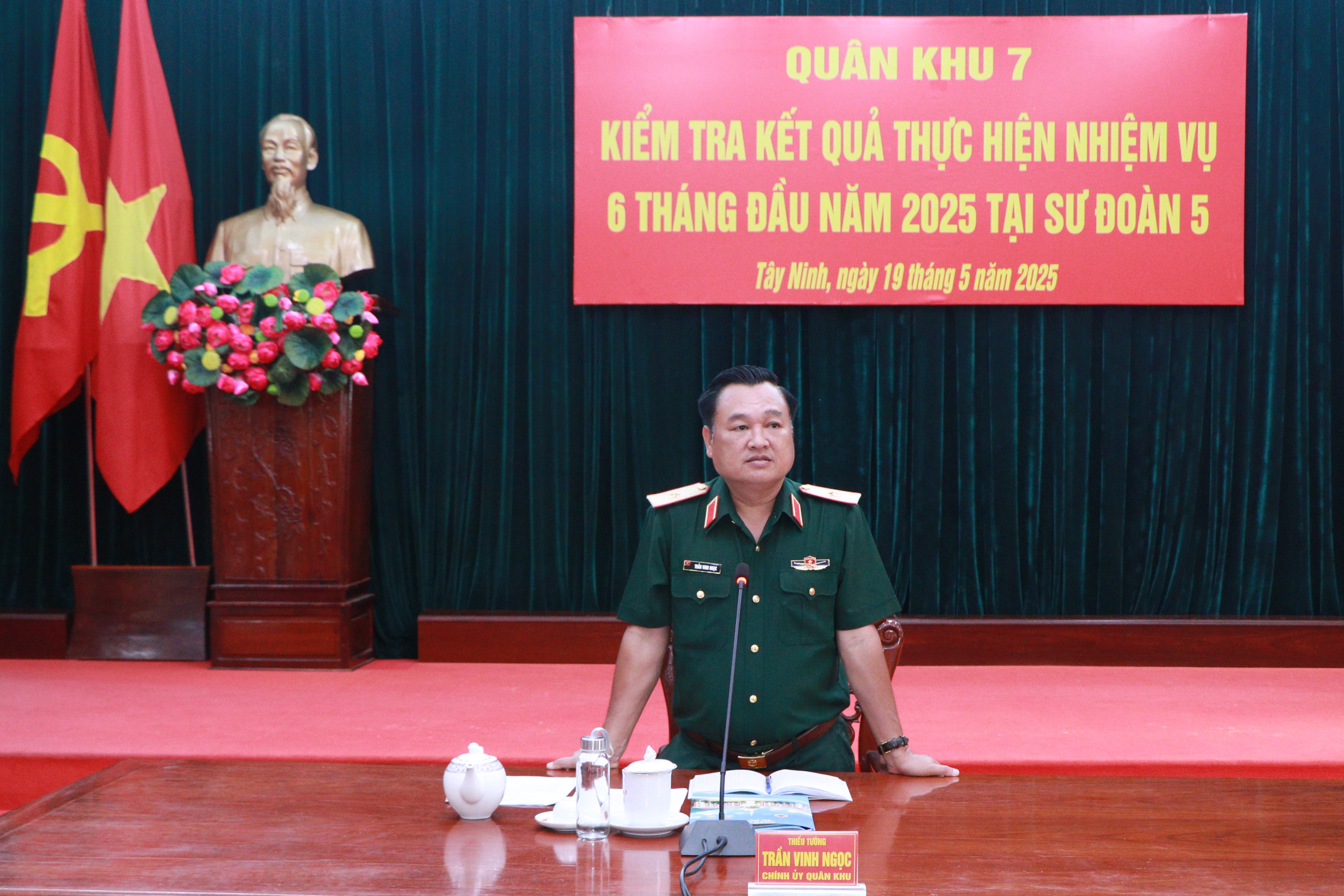 Kết luận kiểm tra,Thiếu tướng Trần Vinh Ngọc, Bí thư Đảng ủy, Chính ủy Quân khu biểu dương, đánh giá cao công tác chuẩn bị, phục vụ kiểm tra và kết quả thực hiện nhiệm vụ 6 tháng đầu năm 2025 của Sư đoàn 5. Đồng thời đề nghị, Đảng ủy, chỉ huy Sư đoàn, cấp ủy, chỉ huy các cơ quan, đơn vị nhanh chóng xây dựng kế hoạch tập trung khắc phục dứt điểm những hạn chế, khuyết điểm mà các thành viên trong đoàn công tác đã chỉ ra. Tiếp tục học tập, quán triệt, thực hiện nghiêm nghị quyết các cấp và của Sư đoàn. Phối hợp với LLVT địa phương nắm chắc tình hình địa bàn, sẵn sàng xử trí khi có lệnh; thường xuyên tổ chức luyện tập chuyển trạng thái sẵn sàng chiến đấu; tổ chức huấn luyện cho các đối tượng đúng, đủ nội dung theo kế hoạch. Tập trung quản lý tốt quân số, duy trì nghiêm kỷ luật, bảo đảm an toàn.