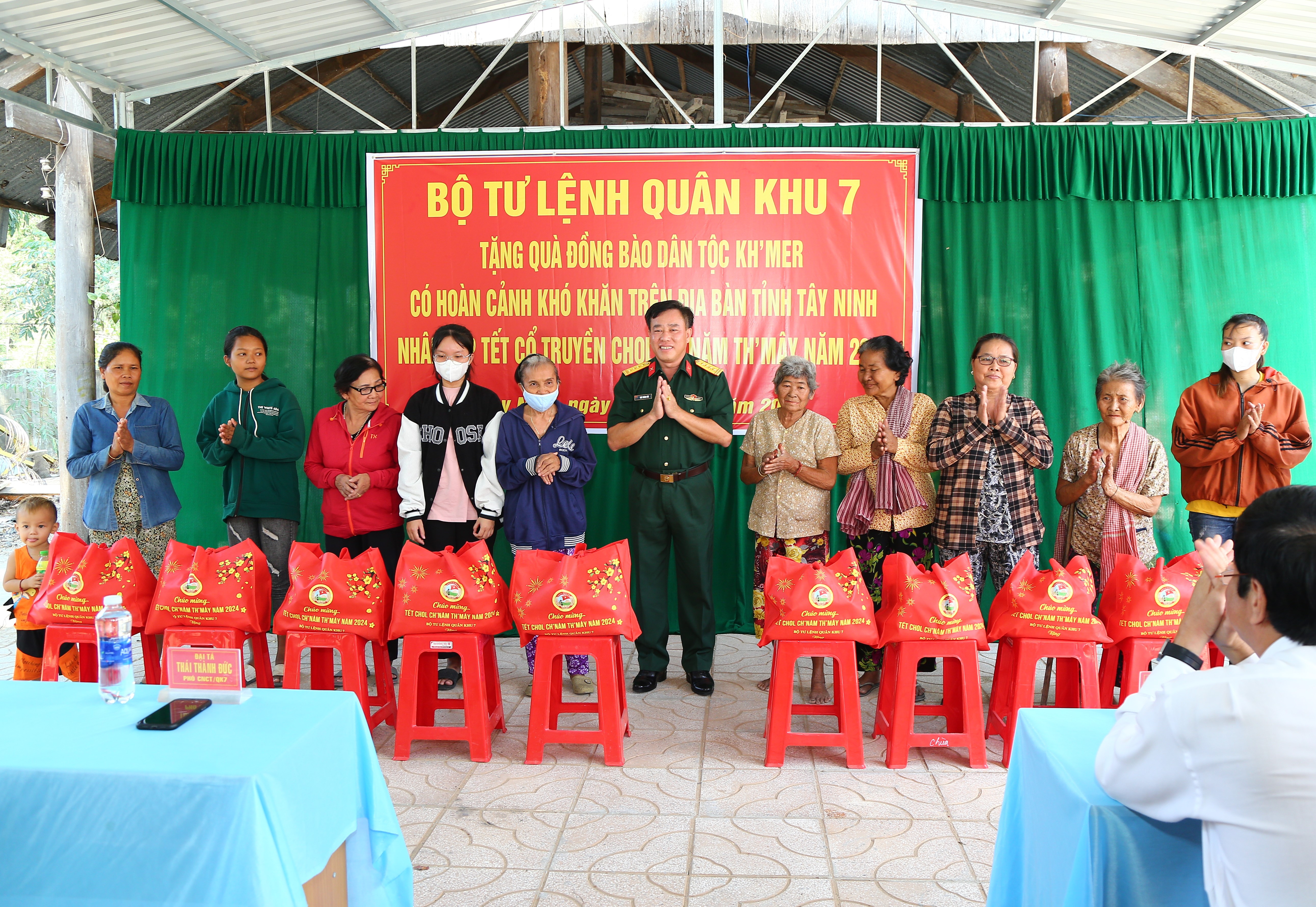 Đại tá Thái Thành Đức tặng quà các gia đình đồng bào Khmer có hoàn cảnh khó khăn xã Hòa Hiệp, huyện Tân Binh, tỉnh Tây Ninh.