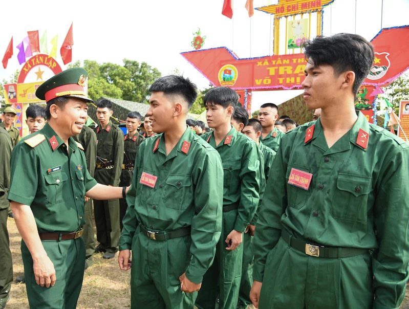 Đại tá Nguyễn Văn Lộc, Phó Chủ nhiệm Chính trị Quân khu 7 động viên thanh niên chuẩn bị lên đường nhập ngũ.