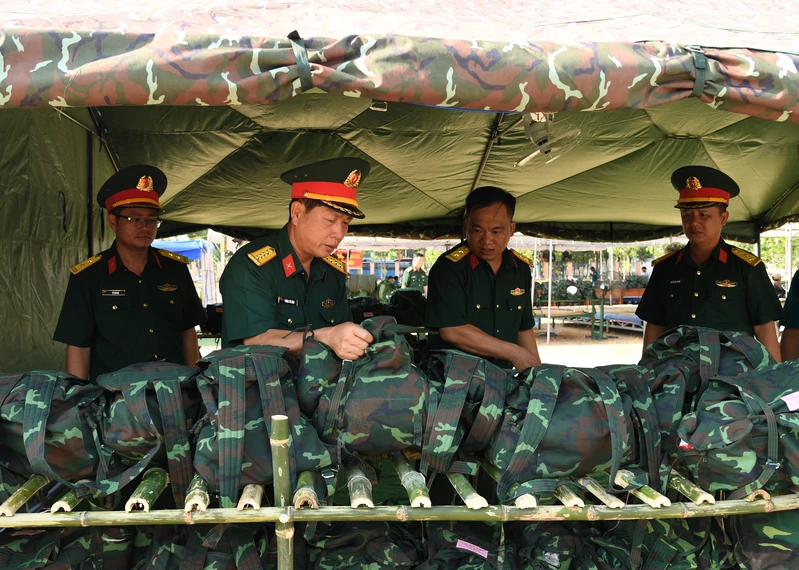 Đại tá Phùng Tấn Hùng, Phó Tham mưu trưởng Quân khu kiểm tra quân trang của thanh niên trước ngày lên đường nhập ngũ.