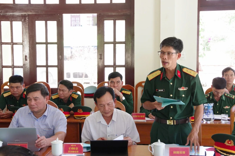 Trung tá Đặng Phú Nhiều, Chỉ huy trưởng Ban CHQS Đặc khu Phú Quý báo cáo kết quả thực hiện nhiệm vụ quân sự - quốc phòng tại Đặc khu Phú Quý.