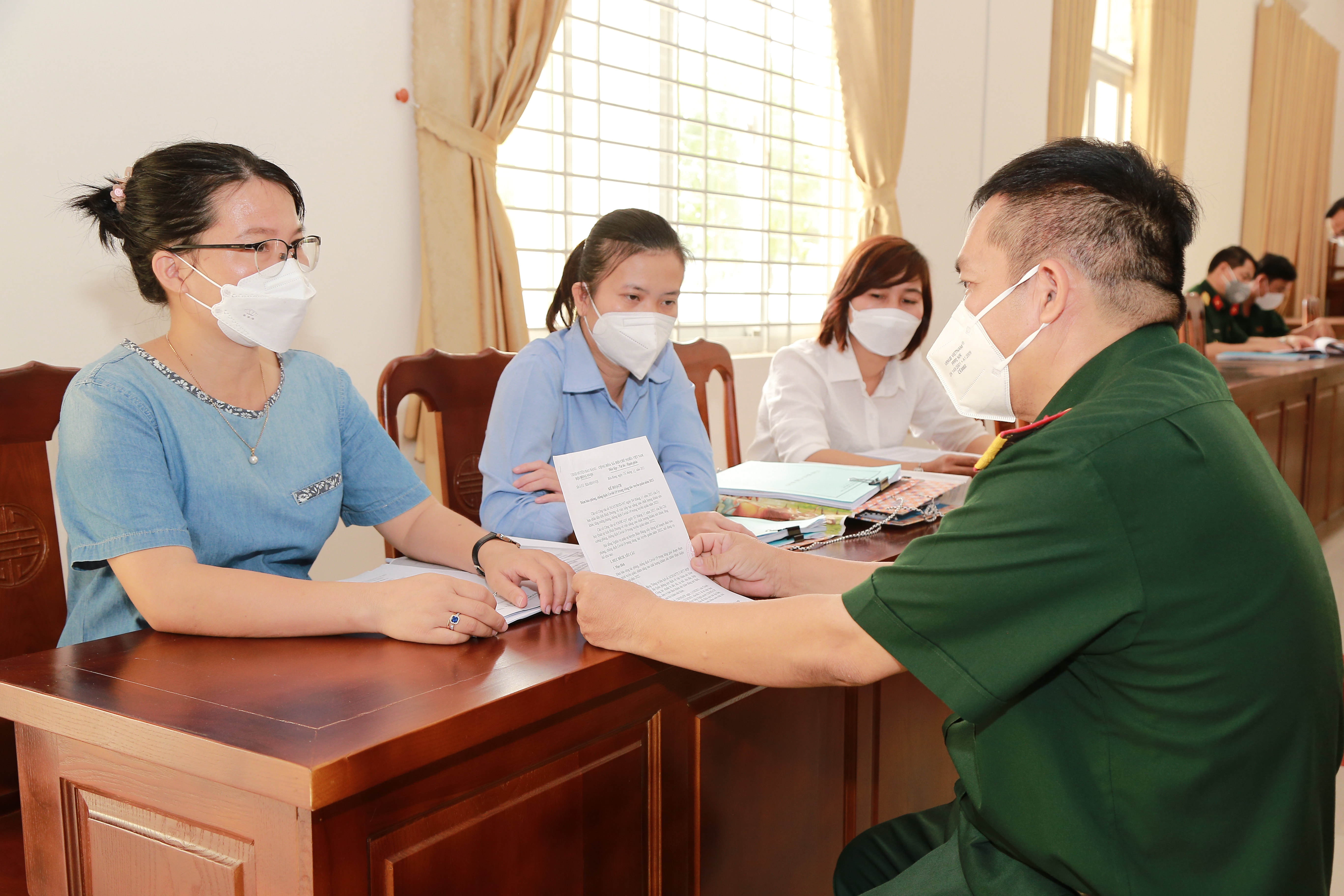 Thành viên đoàn công tác kiểm tra hồ sơ sức khỏe của công dân trước khi lên đường nhập ngũ.