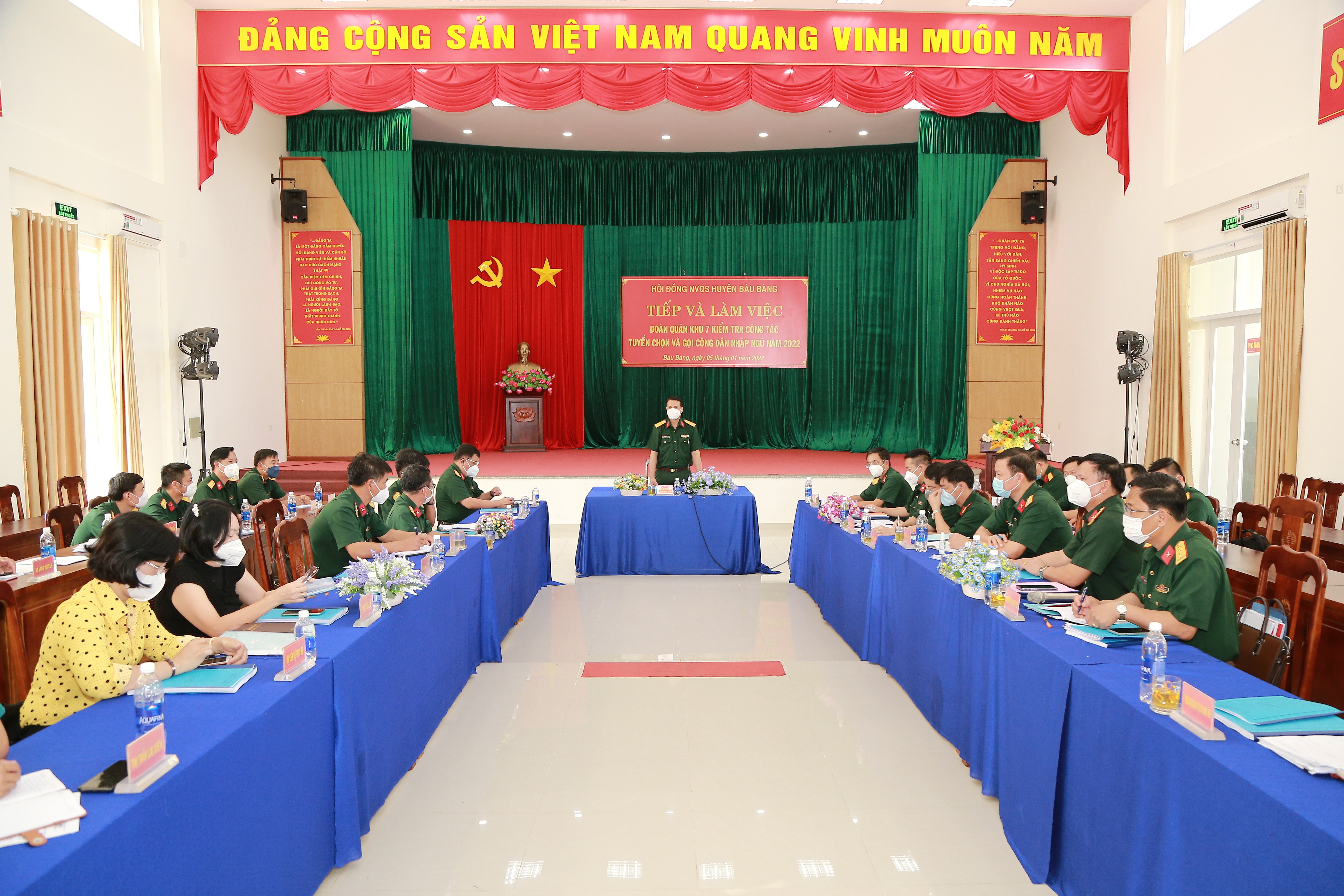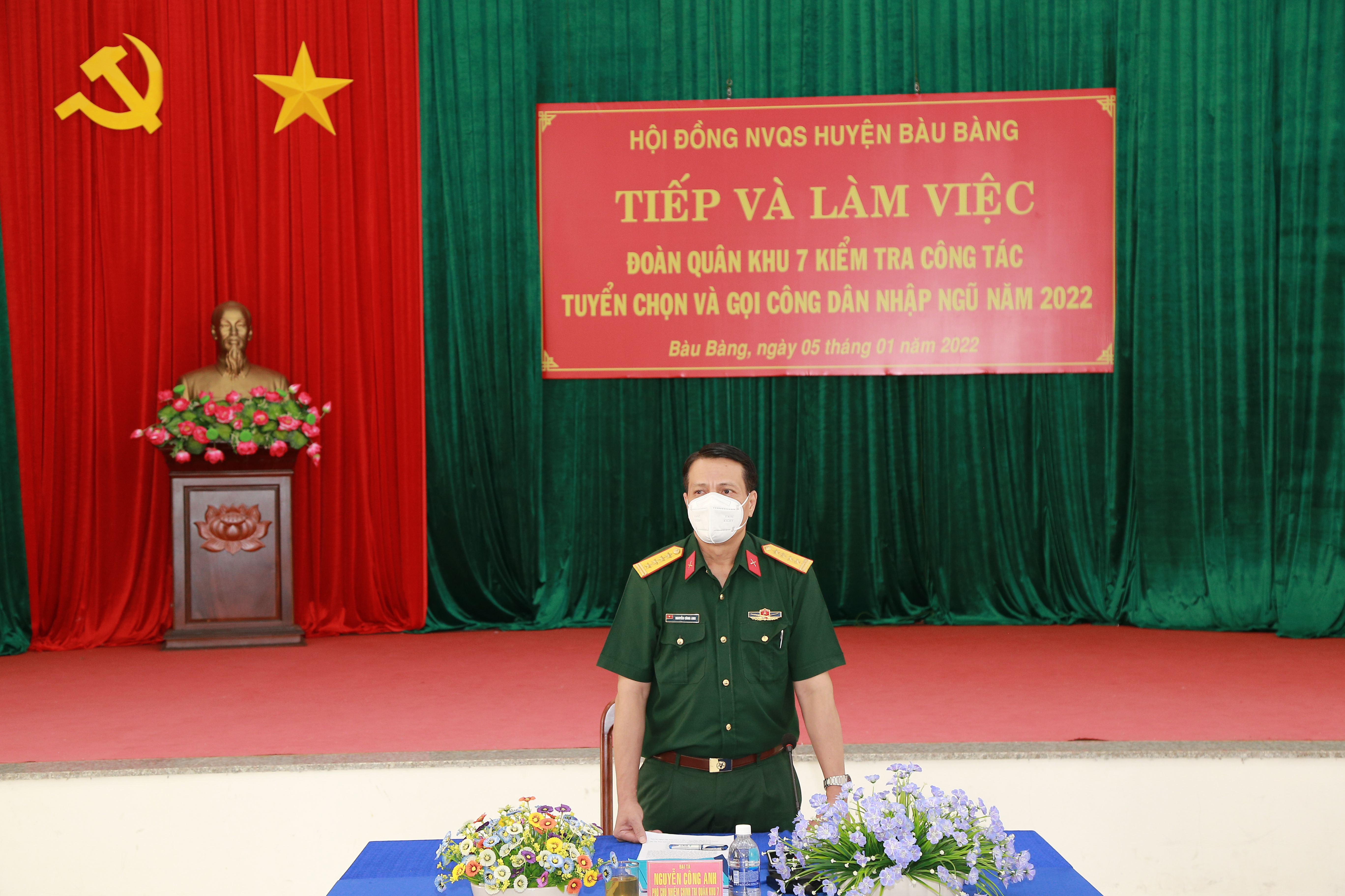 Kết luận kiểm tra, Đại tá Nguyễn Công An, Phó Chủ nhiệm Chính trị Quân khu đề nghị Hội đồng NVQS huyện Bàu Bàng quán triệt, thực hiện nghiêm các văn bản của trên về công tác tuyển chọn, gọi công dân nhập ngũ, đặc biệt Luật NVQS năm 2015. Tiếp tục thực hiện chủ trương nâng cao chất lượng về sức khỏe, trình độ chuyên môn kỹ thuật, tuyển quân tròn khâu “tuyển người nào, chắc người đó”; tuyển chọn hết những thanh niên có sức khỏe loại 1, 2; số có trình độ cao đẳng, đại học, đảng viên để đủ chỉ tiêu. Phối hợp với các cơ quan, ban ngành, địa phương đẩy mạnh các đợt tuyên truyền về công tác tuyển quân cho cán bộ, đảng viên, Nhân dân và thanh niên trong độ tuổi thực hiện Luật Nghĩa vụ quân sự phong phú, sinh động, hấp dẫn. Hiệp đồng chặt chẽ với các đơn vị nhận quân về kế hoạch, thời gian và phương thức tiến hành giao, nhận chiến sĩ mới an toàn, đúng người trong danh sách đã chốt với đơn vị và phòng, chống tốt dịch bệnh Covid – 19.