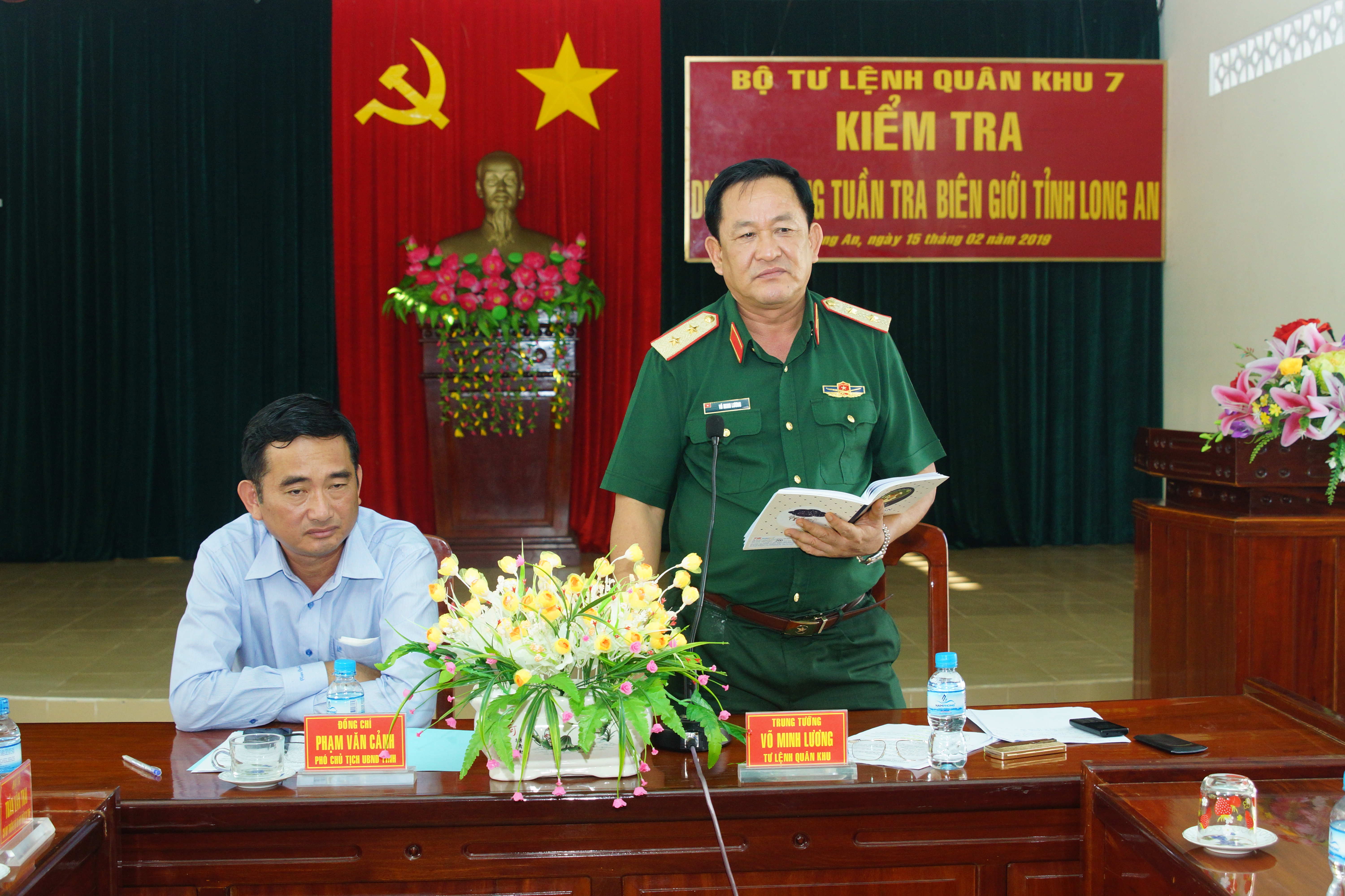 (QK7 Online) - Ngày 15/2/2019, Trung tướng Võ Minh Lương, Ủy viên Trung ương Đảng, Tư lệnh Quân khu 7 đến làm việc và kiểm tra dự án xây dựng đường tuần tra biên giới tỉnh Long An. Đồng chí Phạm Văn Cành, Phó Chủ tịch Ủy ban Nhân dân tỉnh Long An cùng lãnh đạo các huyện có tuyến đường biên giới đi qua; các sở, ban, ngành của tỉnh và nhà thầu, tư vấn giám sát cùng dự buổi làm việc.