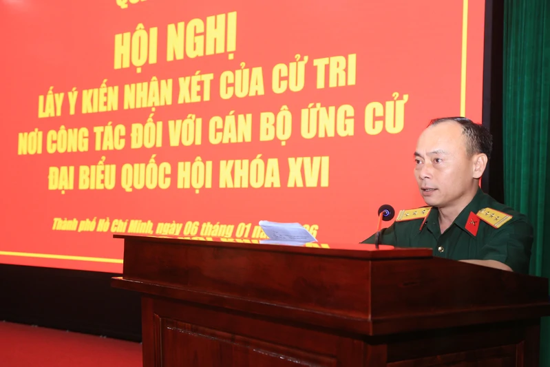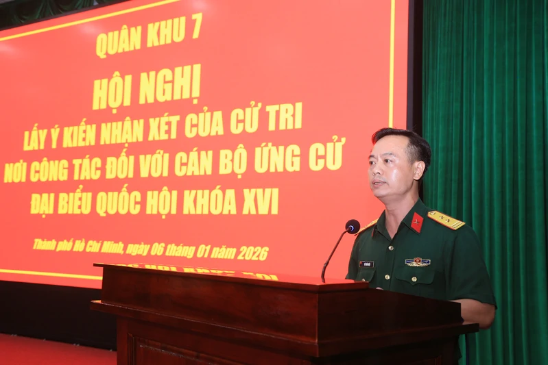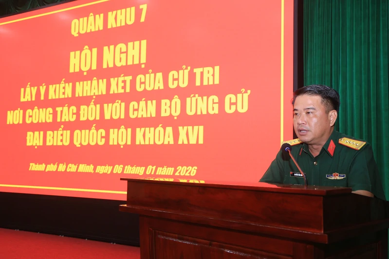 (QK7 Online) - Sáng 6/1, Bộ Tư lệnh Quân khu 7 tổ chức hội nghị lấy ý kiến nhận xét của cử tri nơi công tác đối với cán bộ ứng cử đại biểu Quốc hội (ĐBQH) khoá XVI. Thiếu tướng Trần Chí Tâm, Ủy viên Ban Thường vụ Đảng ủy, Phó Chính ủy Quân khu chủ trì hội nghị. Đại tá Nguyễn Tấn Linh, Đảng ủy viên Đảng ủy Quân khu, Phó Tư lệnh Quân khu tham gia ứng cử ĐBQH khóa XVI.