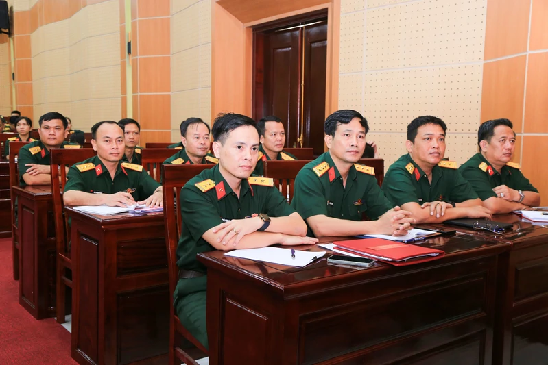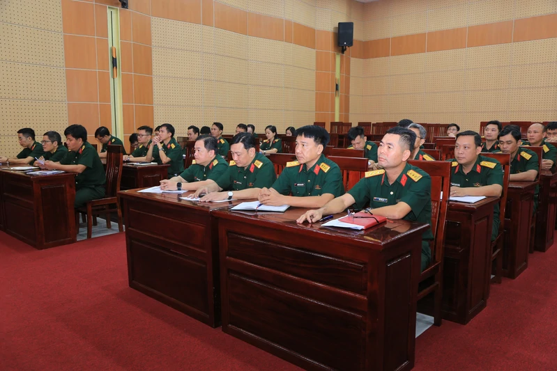 Đại tá Nguyễn Tấn Linh, Đảng ủy viên Đảng ủy Quân khu, Phó Tư lệnh Quân khu (ngoài cùng bên trái) và thủ trưởng các cơ quan Quân khu tham dự hội nghị.