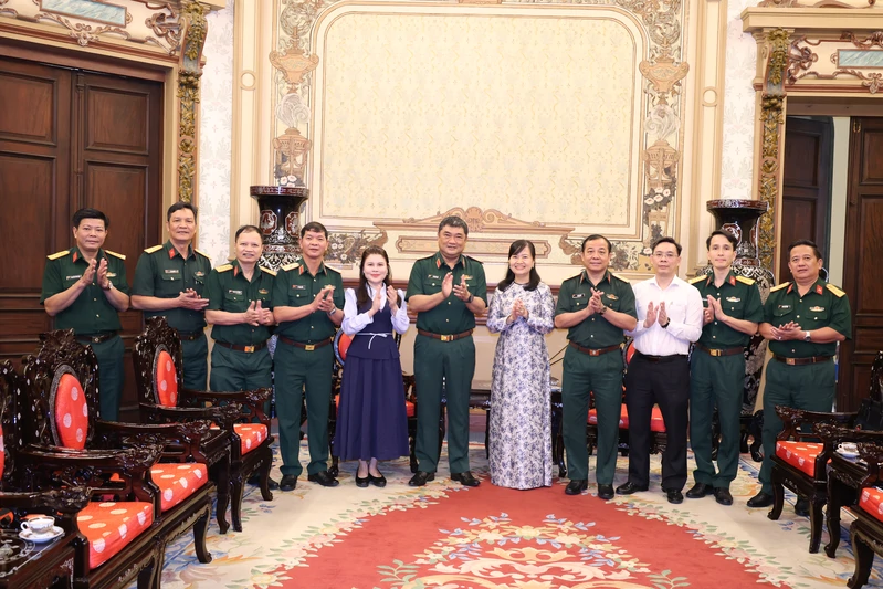 Đồng chí Phạm Quỳnh Anh, Ủy viên Thường trực, Trưởng ban Pháp chế Hội đồng Nhân dân Thành phố chụp ảnh lưu niệm cùng Đoàn công tác Đảng ủy, Bộ Tư lệnh Quân khu 7.