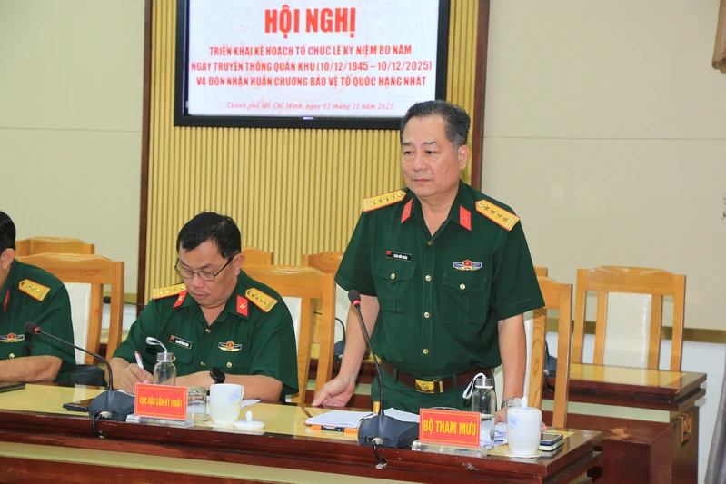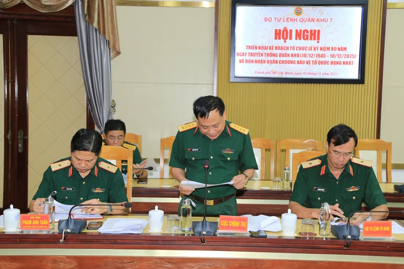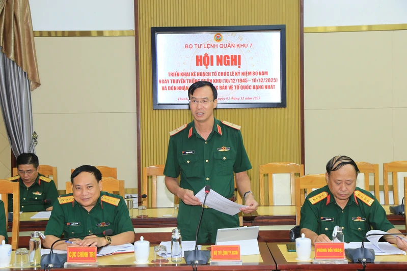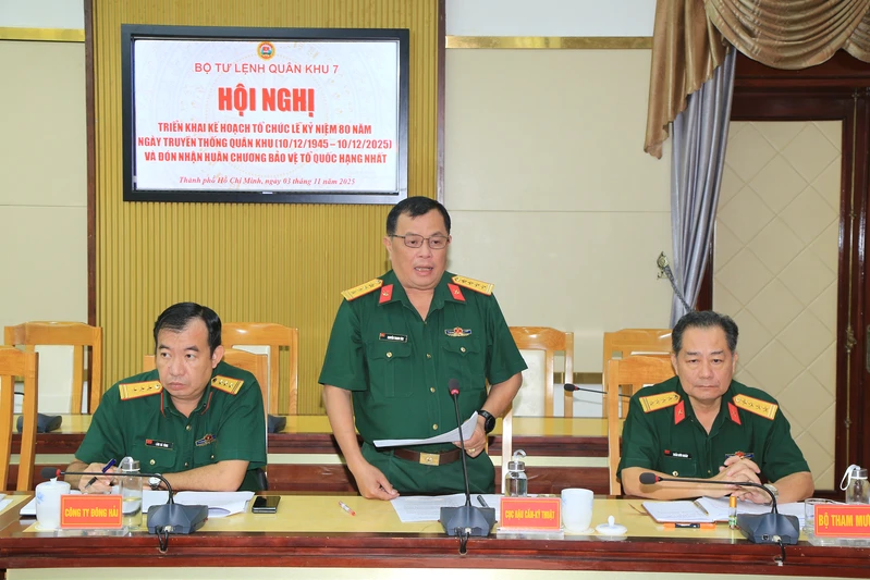 (QK7 Online) - Sáng 3/11, Bộ Tư lệnh Quân khu 7 triển khai kế hoạch tổ chức Lễ kỷ niệm 80 năm Ngày truyền thống LLVT Quân khu (10/12/1945 - 10/12/2025) và đón nhận Huân chương Bảo vệ Tổ quốc hạng Nhất. Thiếu tướng Trần Chí Tâm, Phó Chính ủy Quân khu, Trưởng Ban Tổ chức Lễ kỷ niệm chủ trì hội nghị.