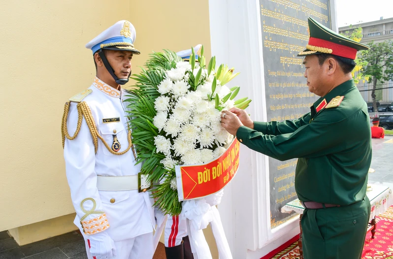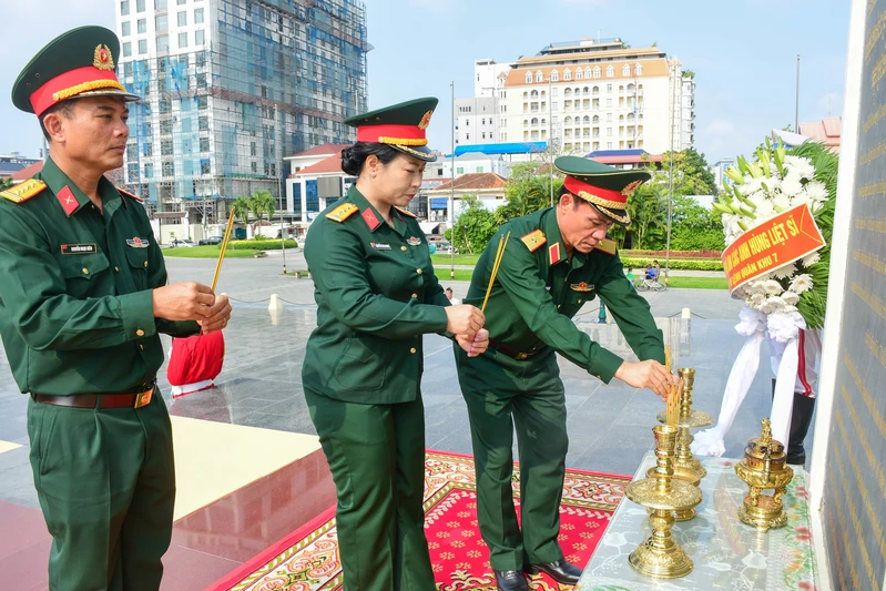 Đoàn cán bộ cấp cao Quân khu 7 dành phút mặc niệm các anh hùng, liệt sĩ Quân tình nguyện Việt Nam tại Thủ đô Phnôm Pênh.