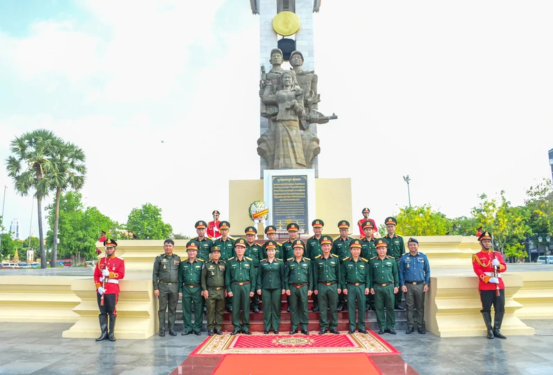 Đoàn cán bộ cấp cao Quân khu 7 chụp hình lưu niệm tại Đài tưởng niệm Quân tình nguyện Việt Nam tại Thủ đô Phnôm Pênh.