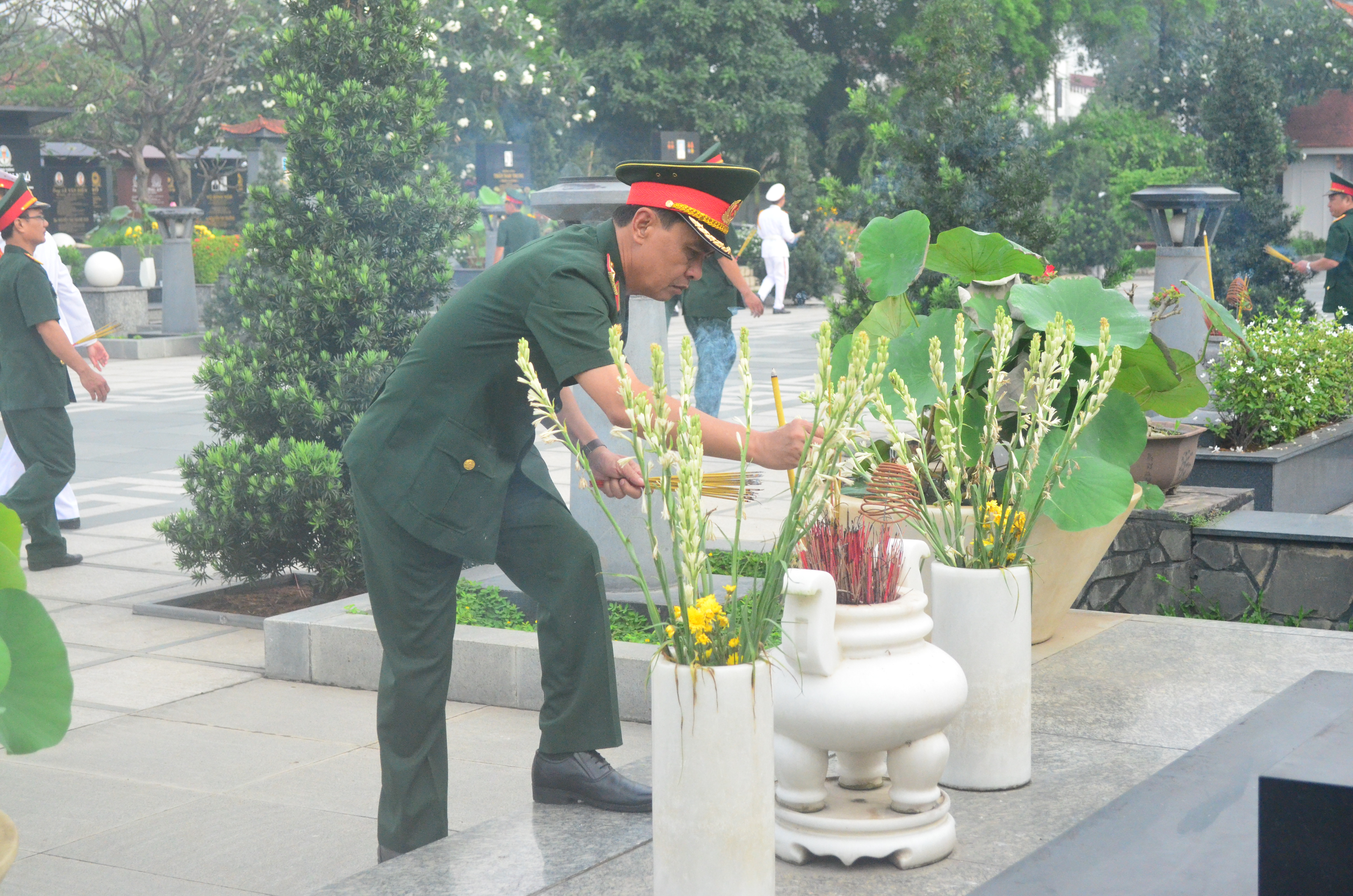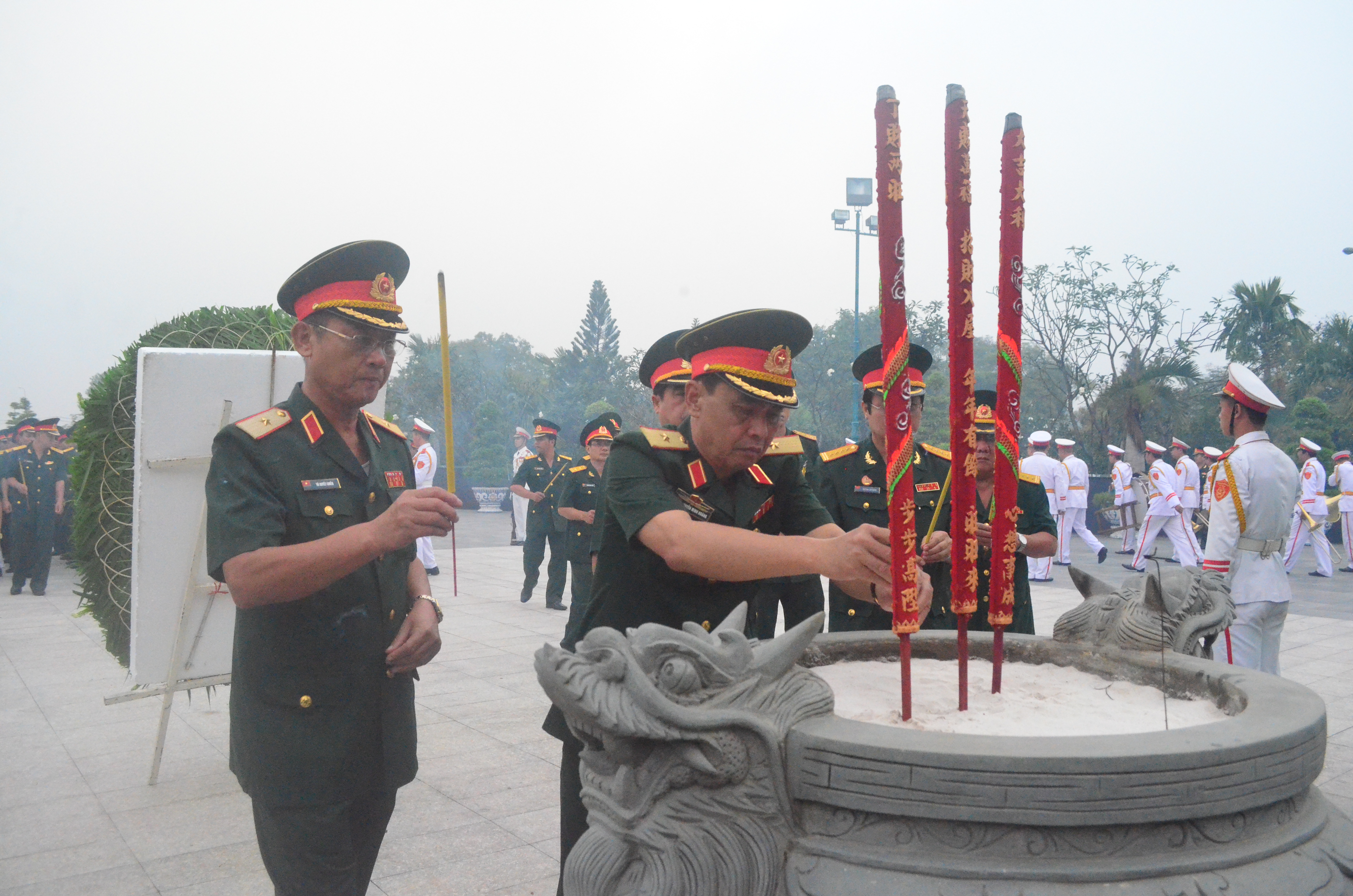 Thiếu tướng Nguyễn Minh Hoàng, Phó Chính uỷ Quân khu 7 và Thiếu tướng Võ Quyết Chiến, Phó Chủ nhiệm Chính trị Quân khu 7 dâng hương đài tưởng niệm các liệt sĩ. Thiếu tướng Nguyễn Minh Hoàng, Phó Chính uỷ Quân khu 7 thắp hương mộ các liệt sĩ.