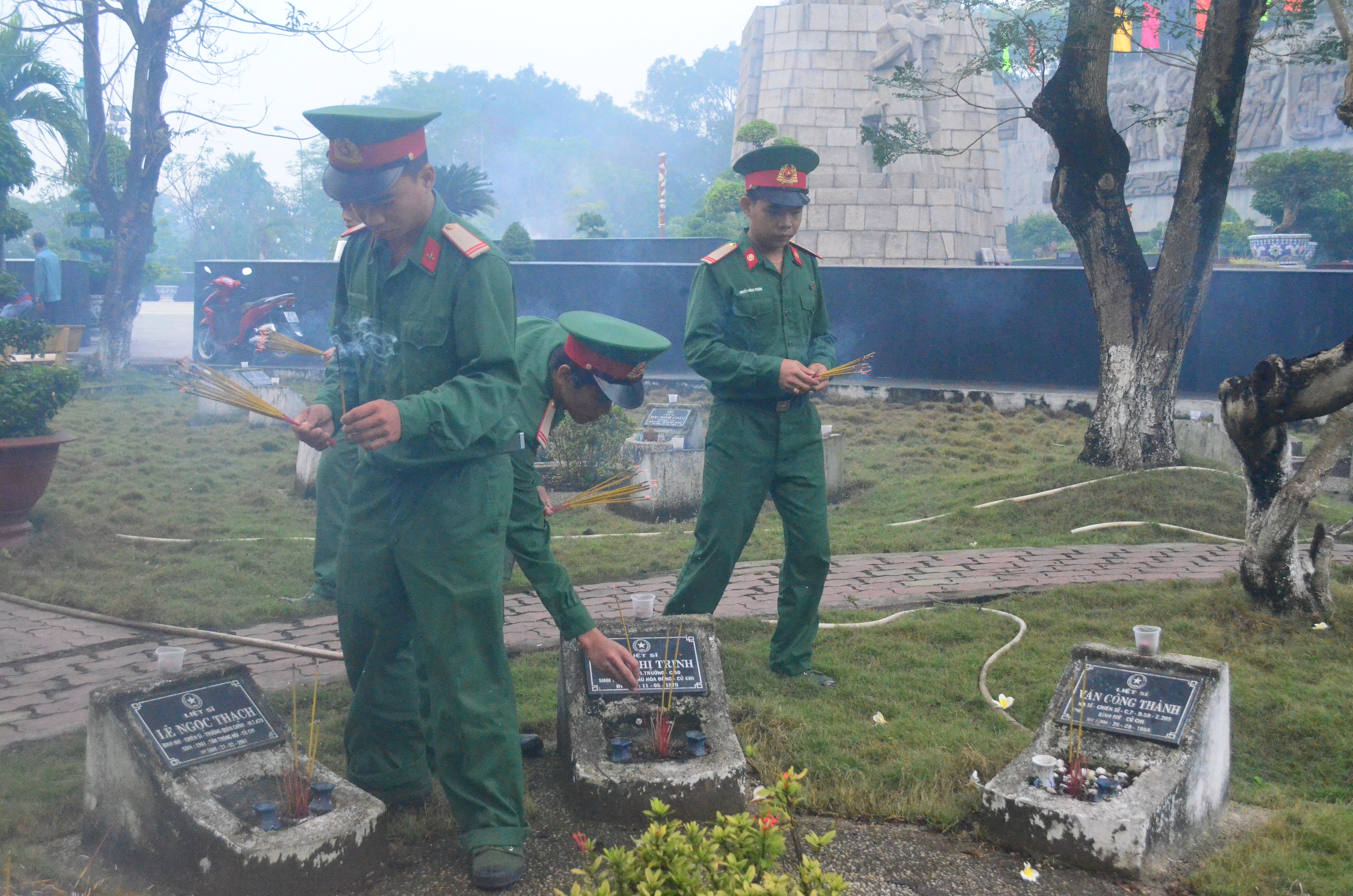 Các chiến sĩ thắp hương cho mộ các liệt sĩ tại nghĩa trang