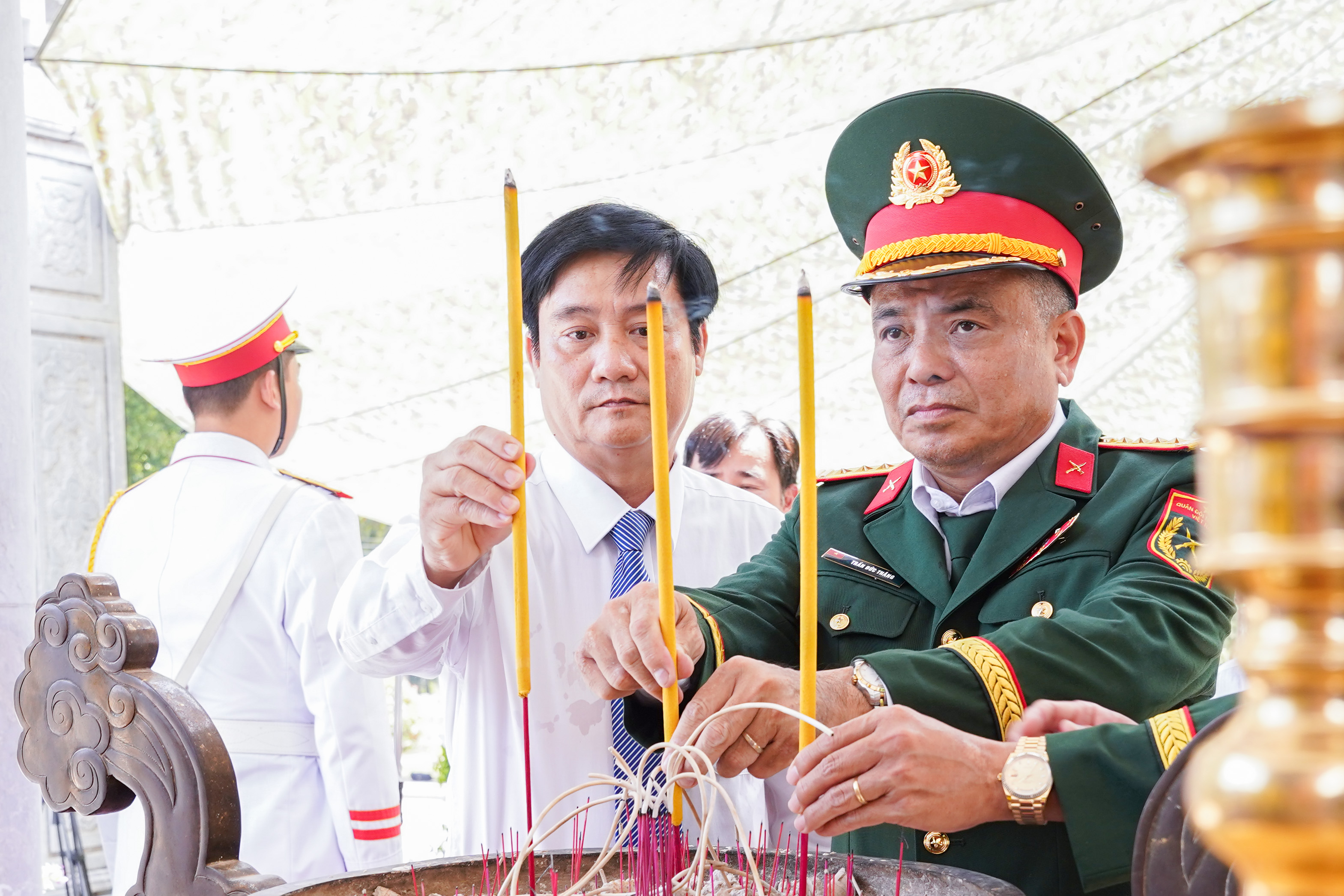 Đại tá Trần Đức Thắng, Phó Chủ nhiệm chính trị Quân khu thắp hương tưởng niệm các anh hùng liệt sĩ.