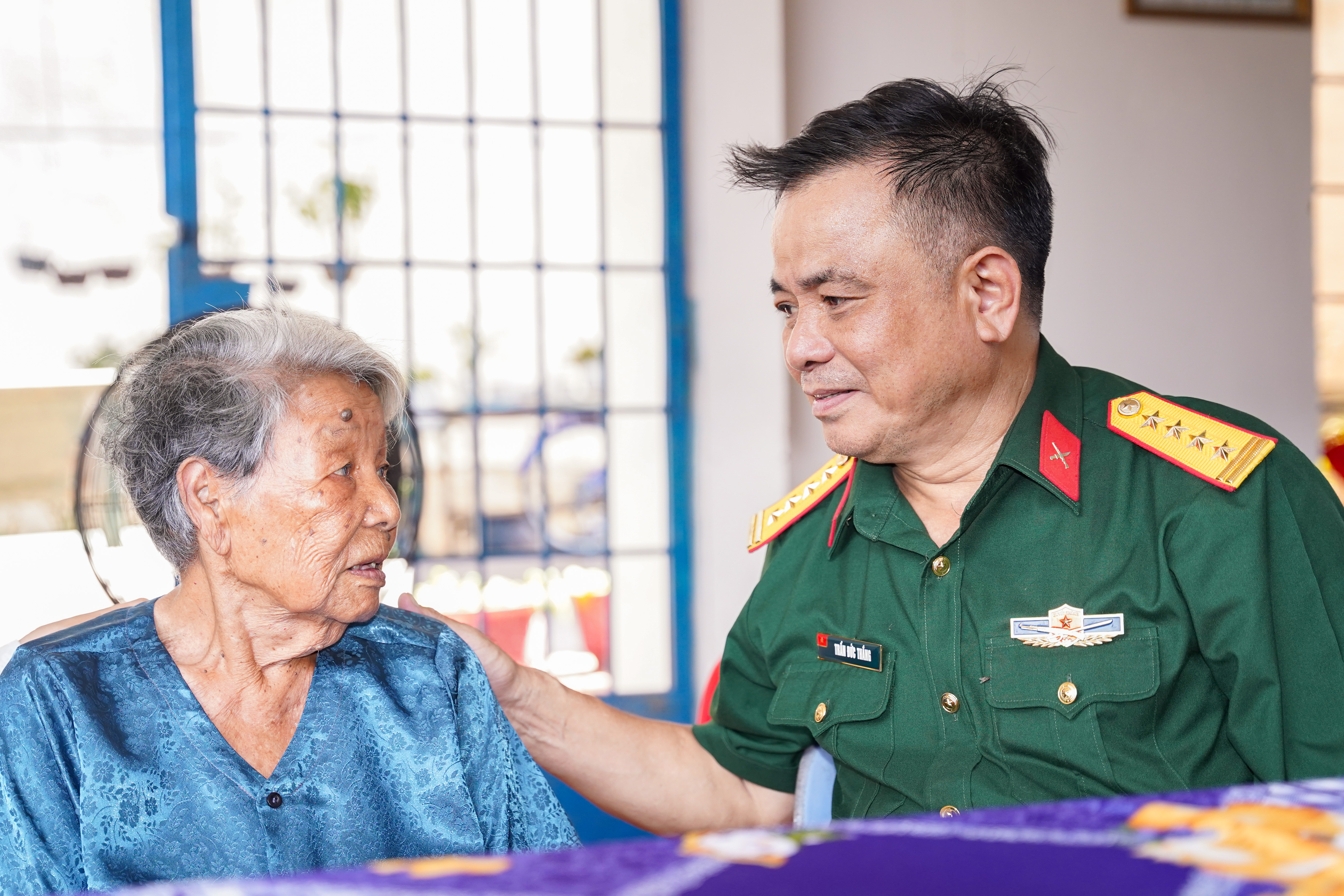 Đại tá Trần Đức Thắng, Phó Chủ nhiệm Chính trị Quân khu thăm hỏi mẹ VNAH Phan Thị Hợi.