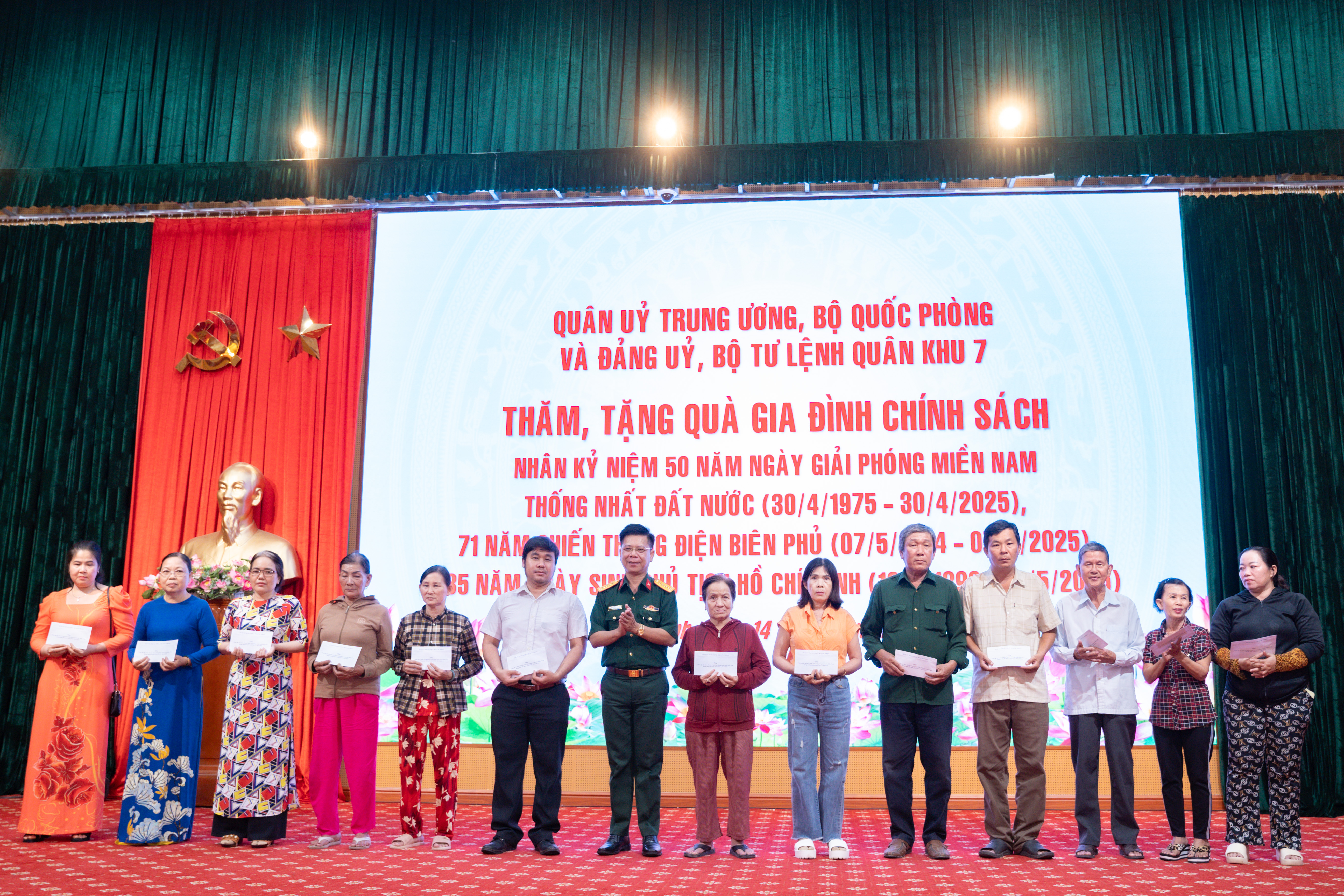 Đồng chí Phó Chủ nhiệm Chính trị Quân khu gửi lời thăm hỏi ân cần, lòng biết ơn sâu sắc đến các đồng chí thương bệnh binh, gia đình liệt sĩ, gia đình có công với cách mạng. Đồng chí khẳng định chiến thắng 30/4/1975 lịch sử có sự đóng góp xương máu và tên tuổi của các anh hùng liệt sĩ đã góp phần tô đậm thêm truyền thống dựng nước và giữ nước của dân tộc Việt Nam anh hùng; mong muốn các đồng chí và gia đình tiếp tục phát huy tinh thần cách mạng, luôn nỗ lực vươn lên trong cuộc sống, sống vui, khỏe và là tấm gương để các thế hệ con cháu noi theo. Đoàn đã trao tặng 50 phần quà của Quân ủy Trung ương Bộ Quốc phòng và 20 phần quà của Đảng ủy Bộ Tư lệnh Quân khu 7 đến gia đình và các đối tượng chính sách.