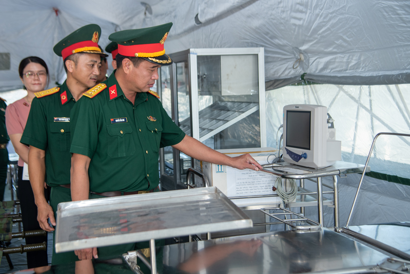 Đại tá Nguyễn Tấn Linh kiểm tra trang thiết bị y tế phục vụ diễn tập quân y chung giữa hai nước Việt Nam - Campuchia.