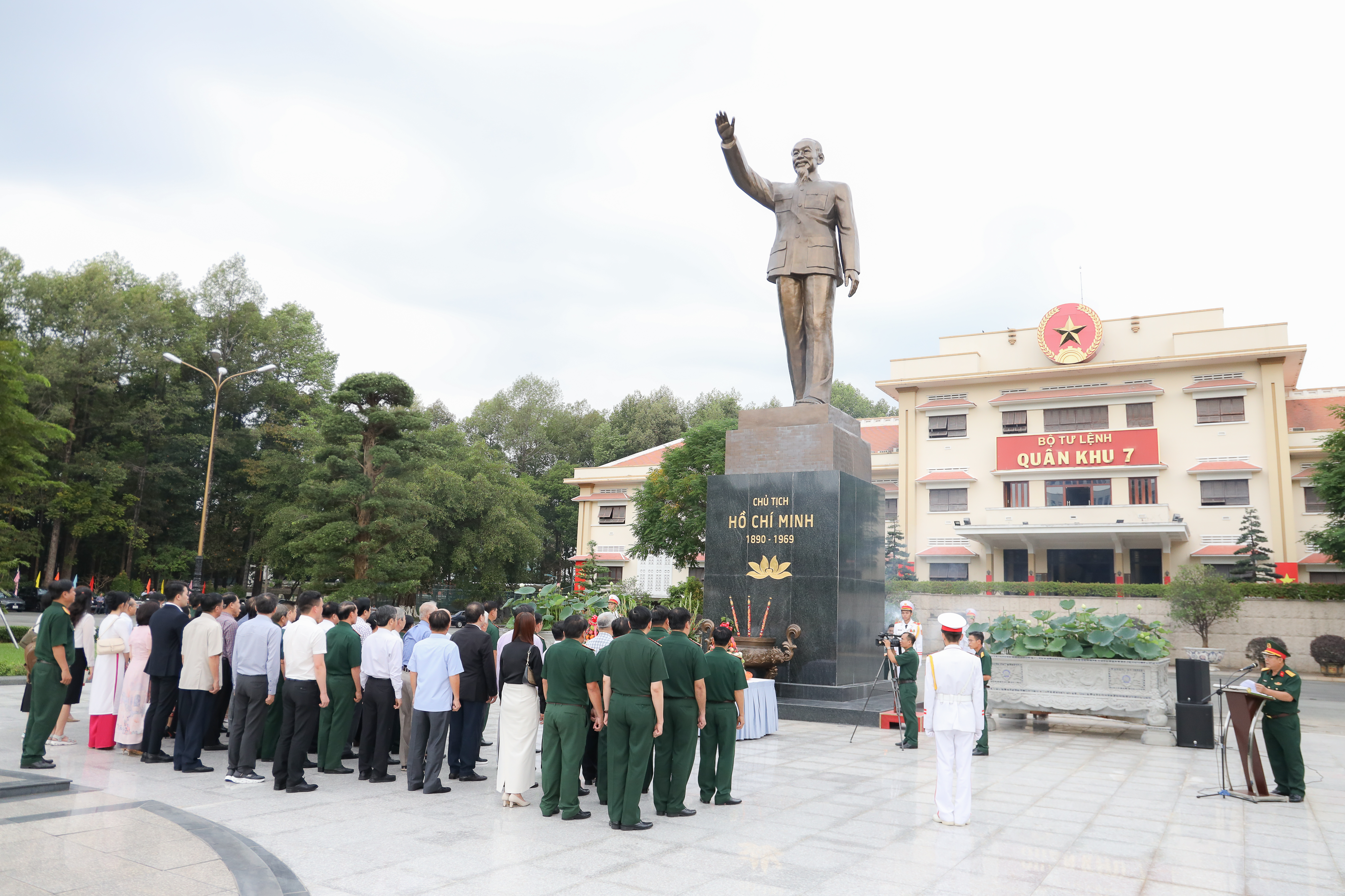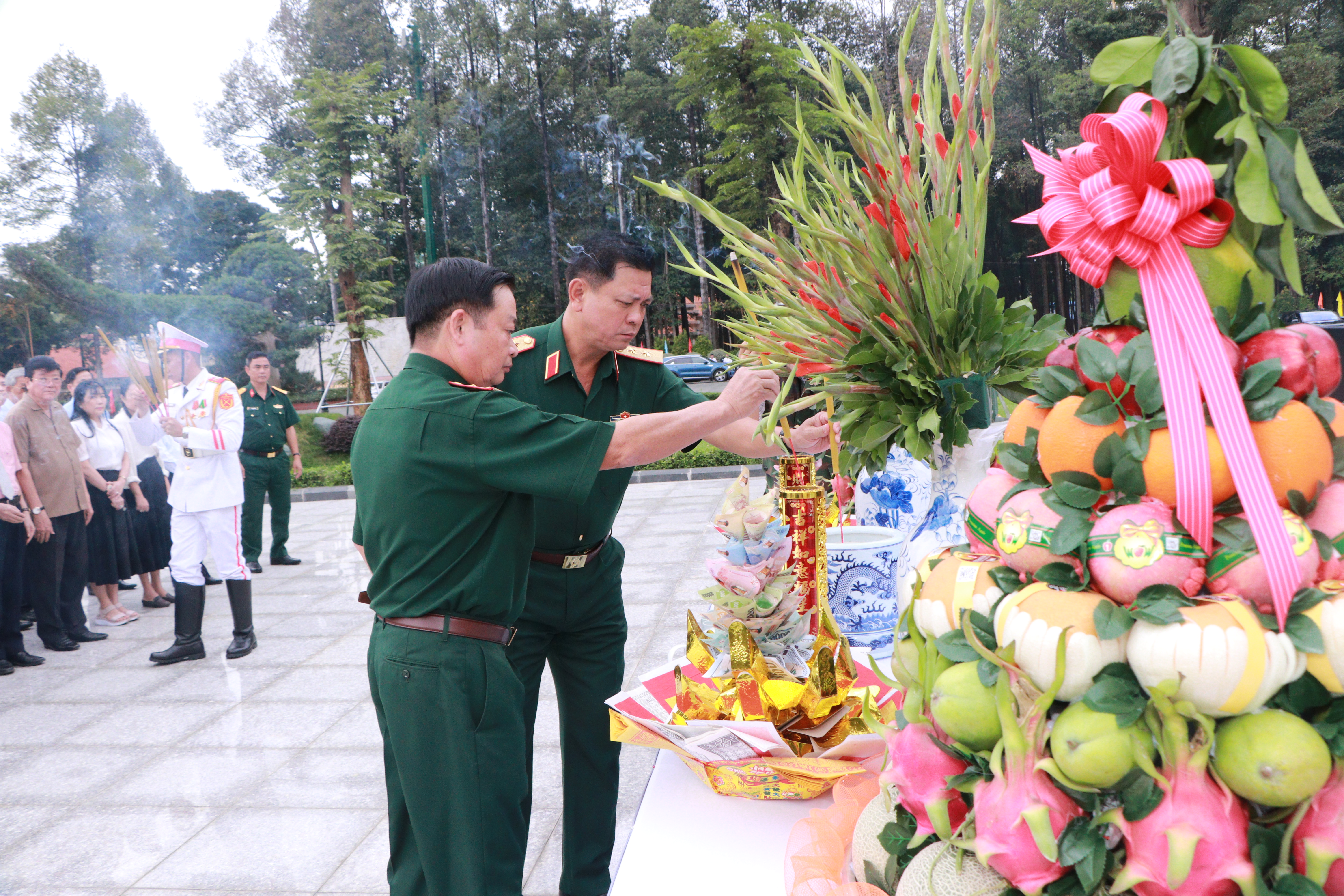 Trước đó các đại biểu đã đến dâng hương tưởng niệm Chủ tịch Hồ Chí Minh tại Đài tưởng niệm Chủ tịch Hồ Chí Minh trước Sở chỉ huy Quân khu.