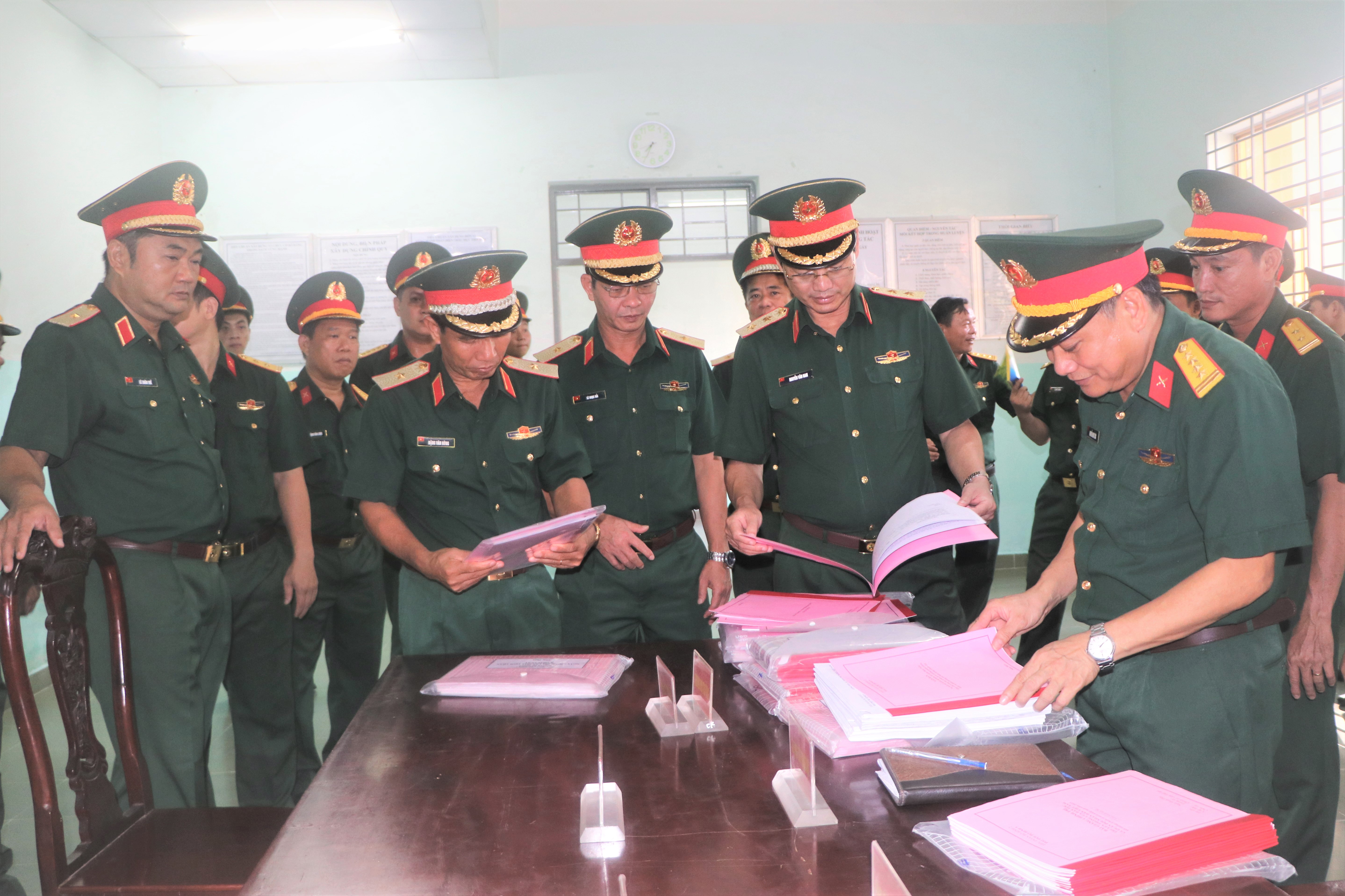 Đoàn công tác kiểm tra sổ sách triển khai thực hiện Chỉ thị 905 của Tư lệnh Bộ Tư lệnh Thành phố về xây dựng đơn vị điểm.